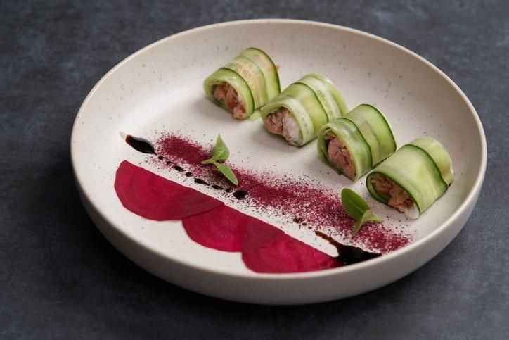 Salatalıkları bir soyucu ile ince dilimler haline getirdikten sonra arasına mini peynir, domates ve zeytinleri eklerek yuvarlayın.
