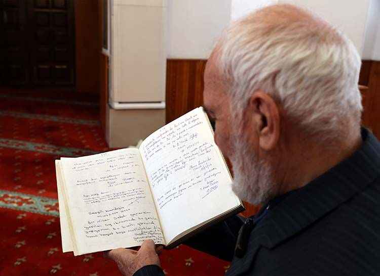 "Camiye mesleki gezi için ya da merak edip turistik amaçla gelenler oluyor. Ben de 'Ziyaretçi defteri yapayım, insanların hatıraları olsun, noksanlarımızı bilelim, eleştirsinler.' diye düşündüm. Eleştirilen yönler vardır, kendimizi düzeltiriz. Gelen akademik insanlarla da bire bir diyaloğa girdim. Aynı üniversite öğrencileri gibi derslerine katıldım. Oradan da yola çıkarak camiyi ziyarete gelen insanların burada hatırası olsun, daha sonraki yıllarda burada görev yapacak arkadaşlara da motivasyon olsun istedim."