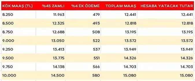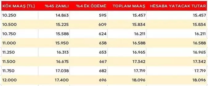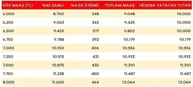 Yüzde 45'lik zam oranının gerçekleşmesi ve en düşük emekli maaşının 10 bin TL olması durumunda emekli maaşı tablosu şöyle olacak:
