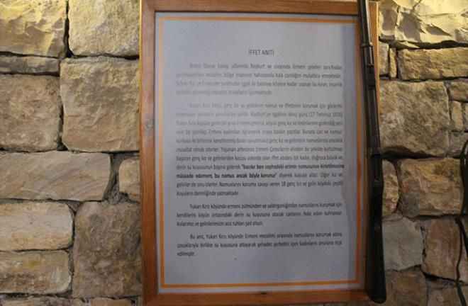 "Bu topraklar kolay kazanılmadı" şeklinde konuştu. Şehit Türk kadınlarının anısına anıt içerisinde yapılan müzede yer alan bir tabelada yer alan yazıda, Ermeni çetelerinin elinden bir şekilde kaçan ve kocası askerde olan genç kadın su kuyusunun başına gelerek, "bacılar ben cephedeki erimin namusunun kirletilmesine müsaade edemem, bu namus ancak böyle korunur" diyerek kuyuya atlar.