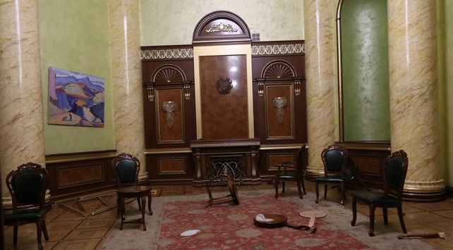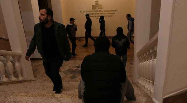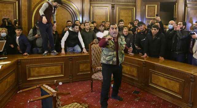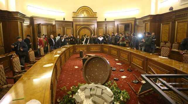 Hükümet binasının camlarına kırarak içeri giren protestocular, Paşinyan ve Ermenistan aleyhine sloganlar attı.