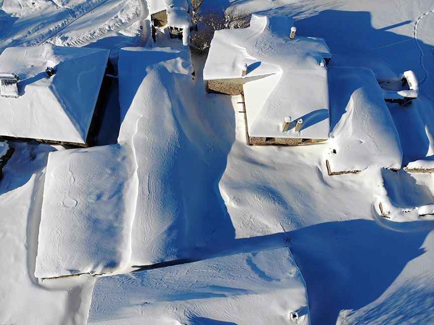 Beyaz örtüyle kaplanan köylerdeki ev ve ahırlar, dron ile görüntülendi.