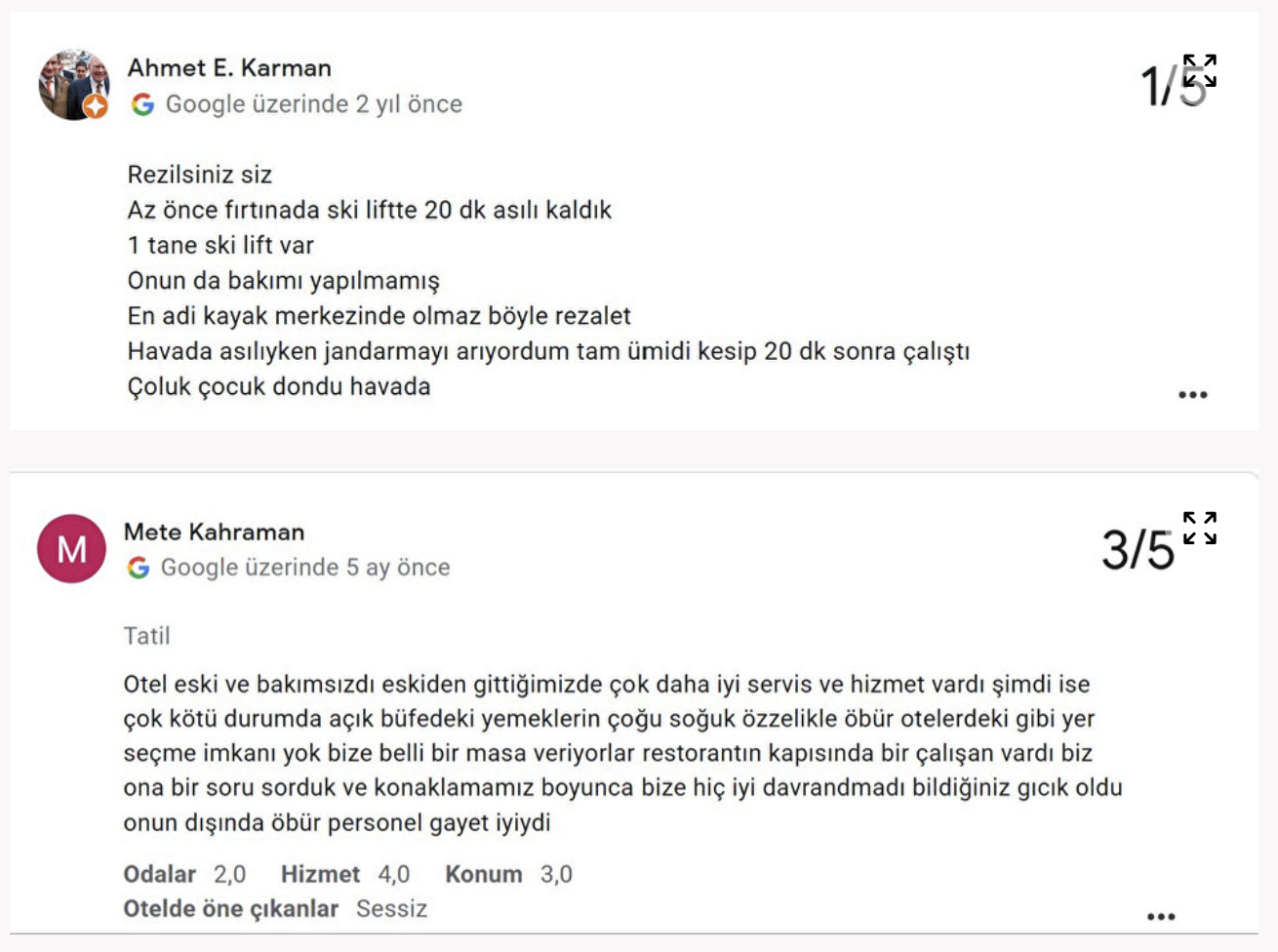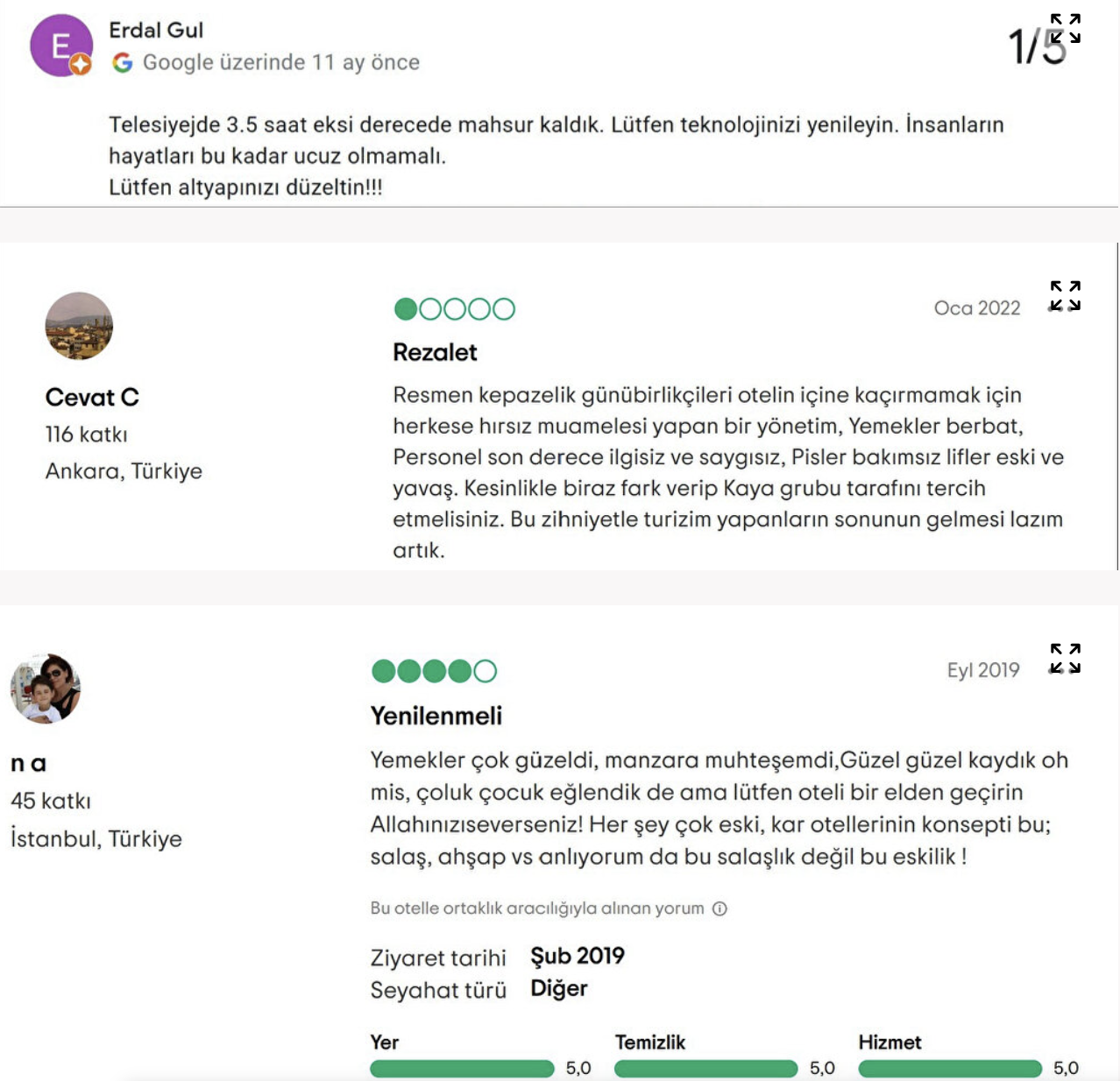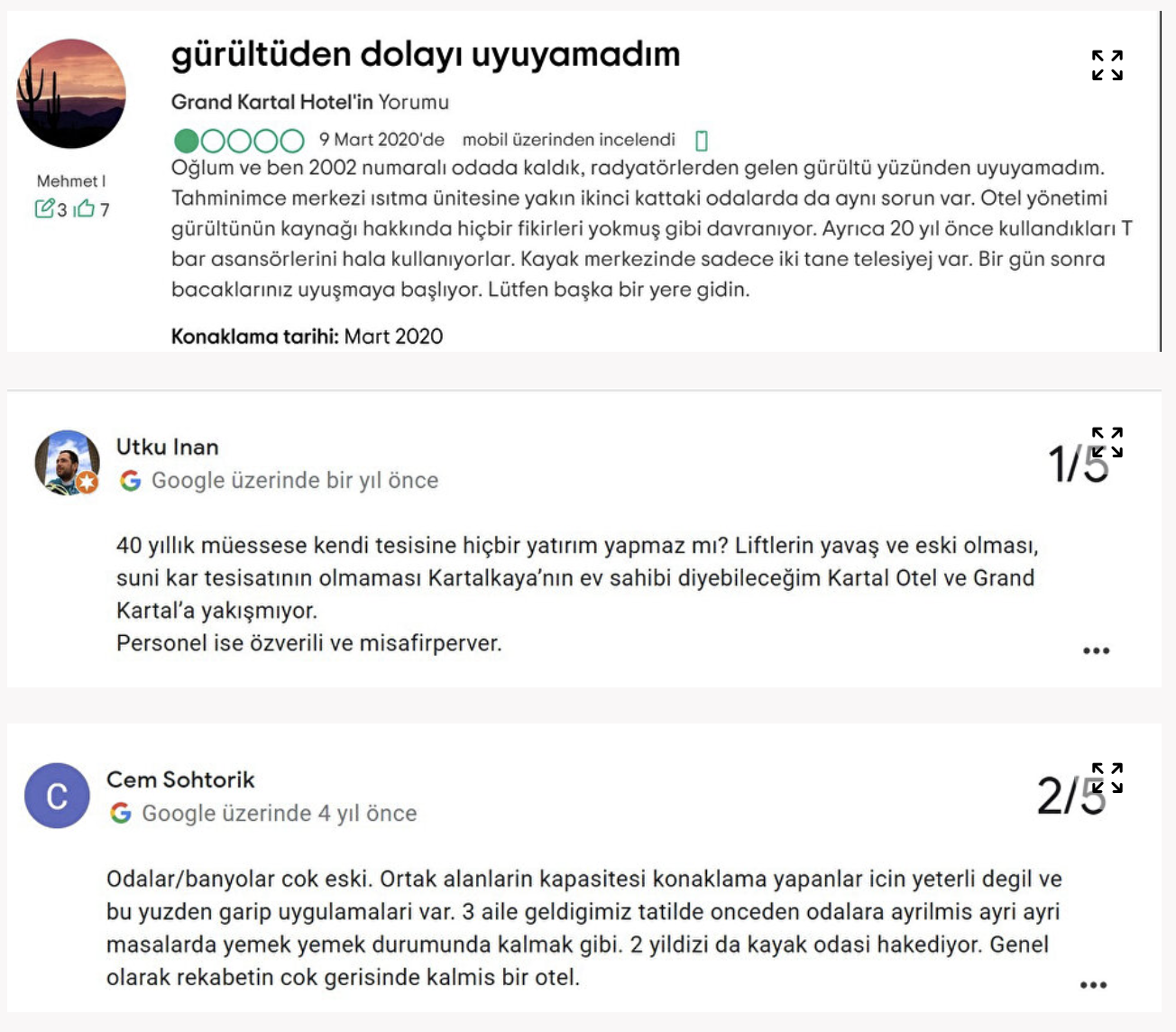 Yangın sonrası yapılan ilk değerlendirmelerde, Grand Kartal Otel’in altyapısının yetersiz olduğuna dair şikayetler gündeme geldi. Otel hakkında yapılan birçok yorumda, ziyaretçilerin teknik arızalar nedeniyle kayak yaparken mahsur kaldıkları ve otelin bakımının eksik olduğu belirtildi. Sosyal medya üzerinden yapılan yorumlar, otelin eski ve bakımsız olduğuna dair ciddi eleştiriler içeriyor. Oteldeki altyapı sorunlarına dikkat çeken kullanıcılar, kayak tesislerinin arızalı olduğuna ve acil durumlarda yeterli yardım almadıklarına dair şikayetlerde bulunmuşlardı.