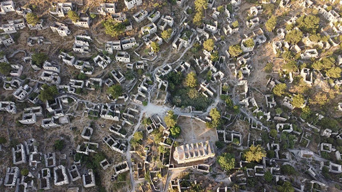 Kayaköy dağın yamacında ve birbirinin manzarasını kesmeyen yapılardan oluşuyor.