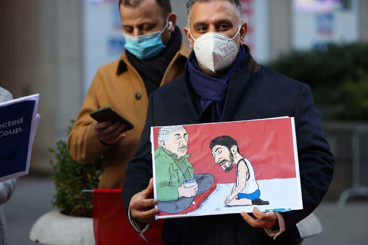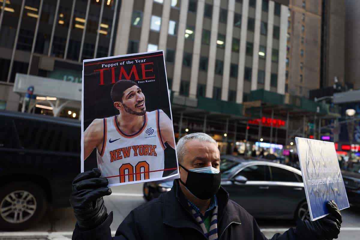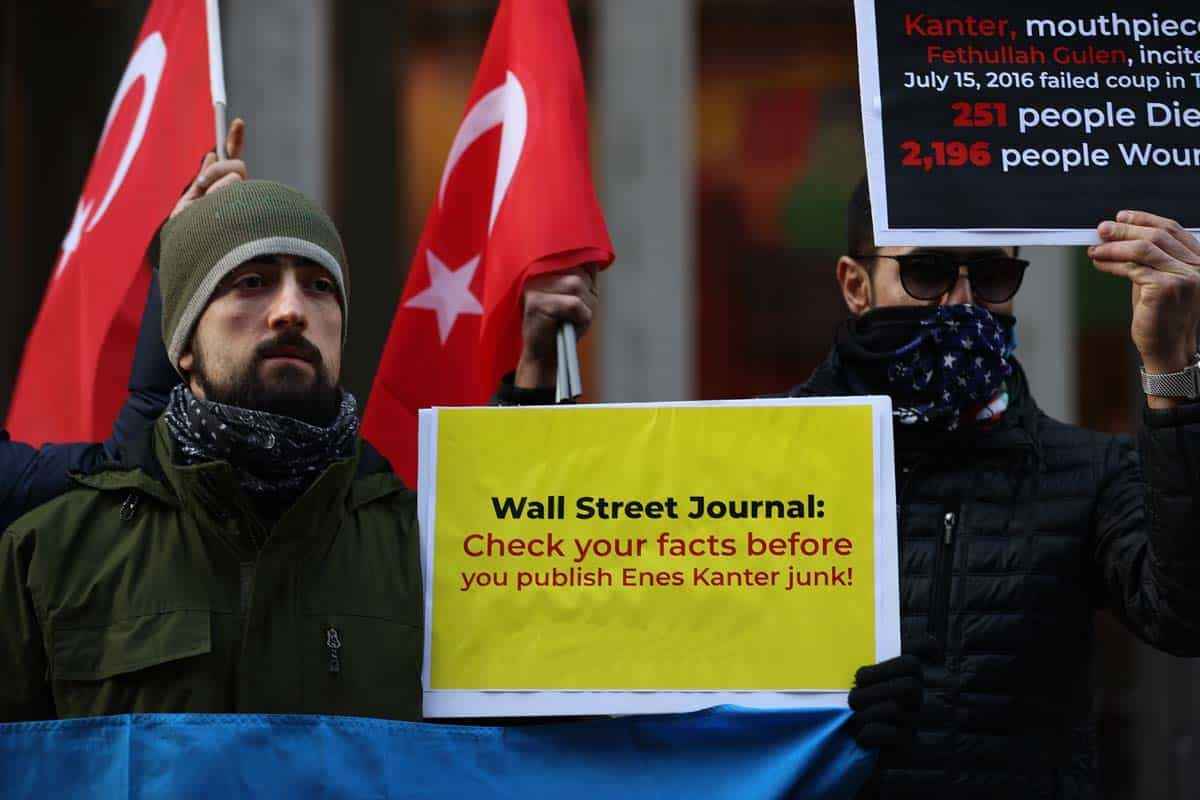 Protestoda, Enes Kanter'i FETÖ elebaşı Fetullah Gülen'in kuklası olarak gösteren karikatürler ve resimli anlatımlar da yer aldı.