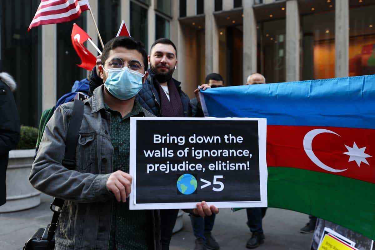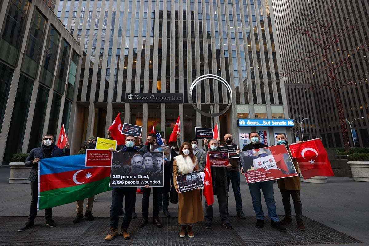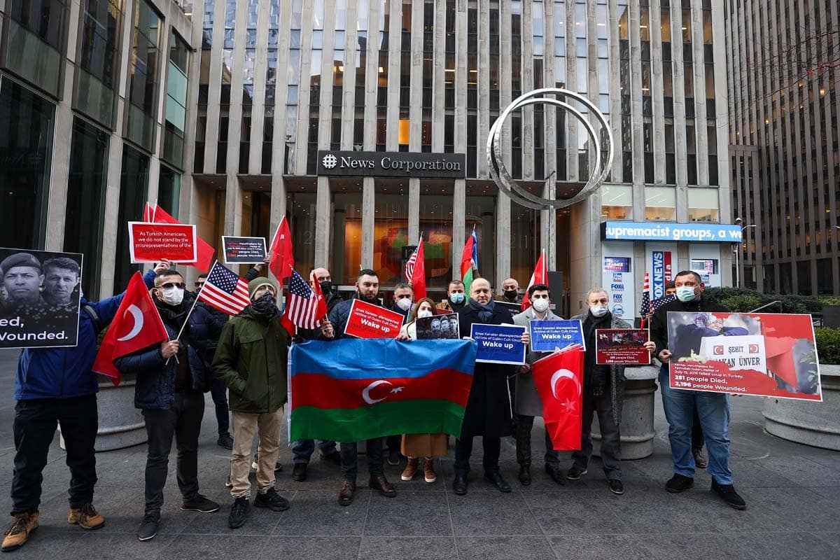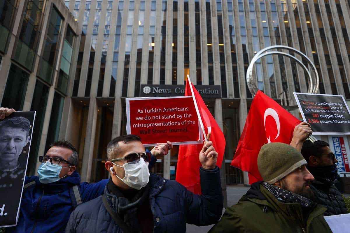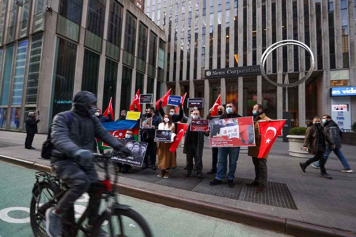 FETÖ'cü Enes Kanter'i ve WSJ'nin yayın politikasını gazete binası önünde toplanarak protesto eden Türk vatandaşları, 15 Temmuz 2016'daki darbe girişimi hakkında bilgi veren dövizlerle tepkisini gösterdi.