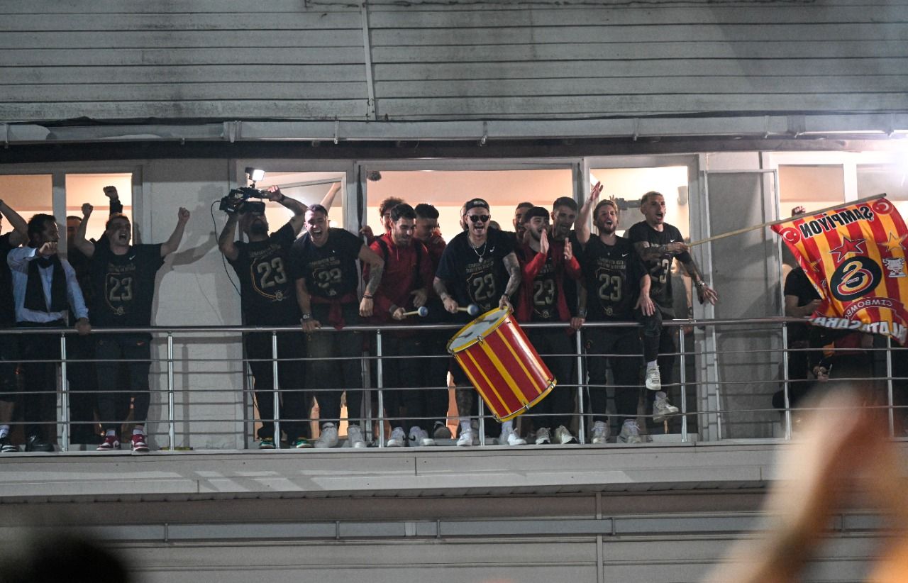 Bu sezon attığı 21 golle takımının şampiyonluğunda başrolü oynayan futbolcu, balkonda aldığı mikrofonu hiç bırakmadı.