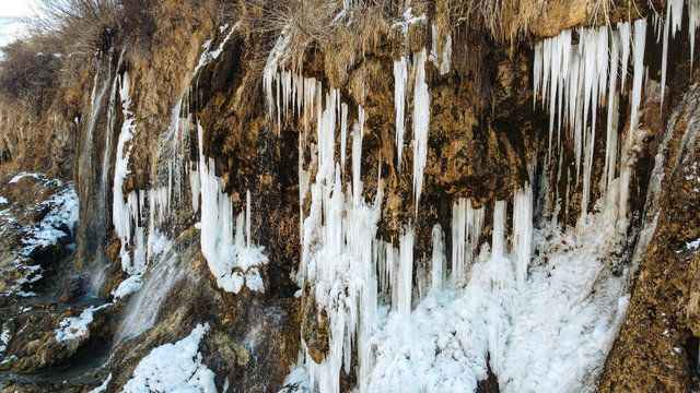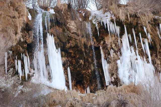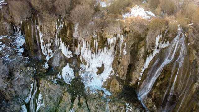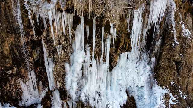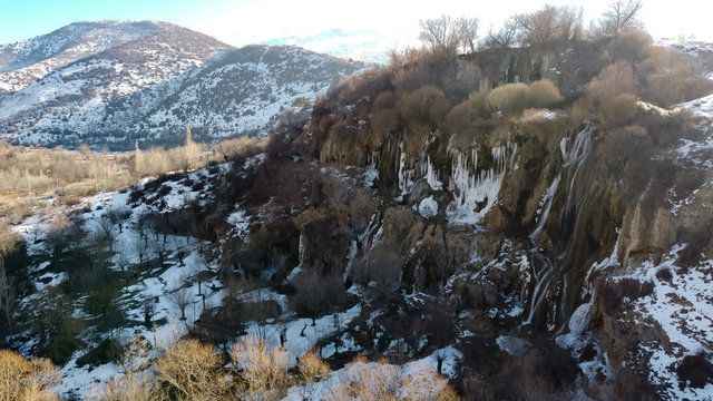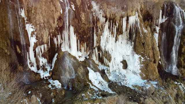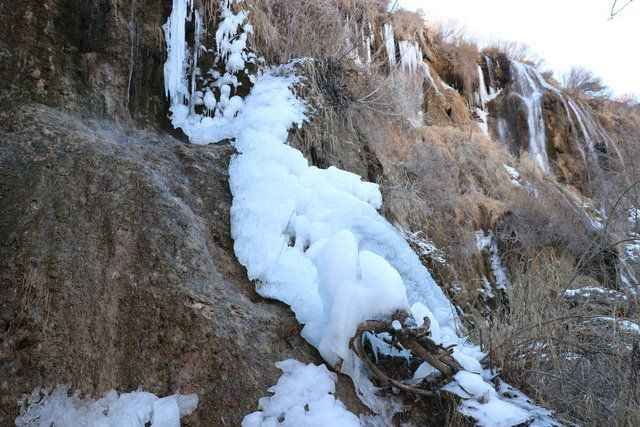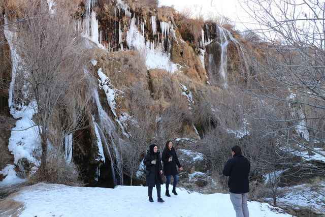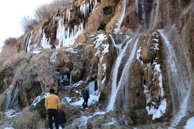 Erzincan'da soğuk havanın etkisi ile büyük bölümü donan Girlevik Şelalesi'nde uzun buz sarkıtları meydana geldi