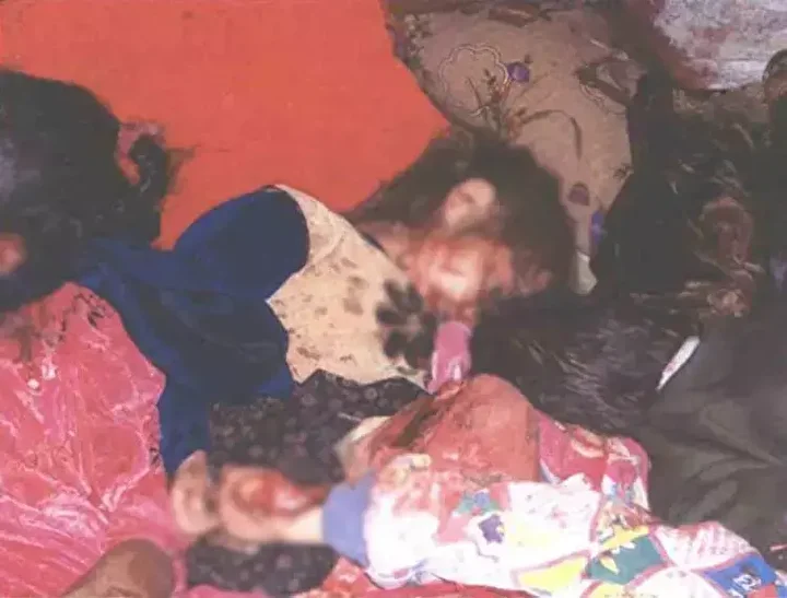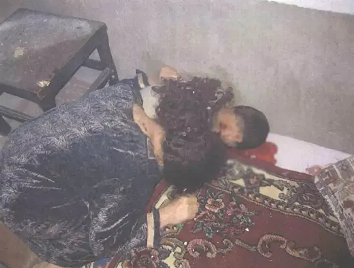 15 yaşındaki Nur Yunus Salim, annesinin ve dört kardeşinin öldürüldüğü yatağın yanında. Nur'un hayatta kalan kız kardeşi Safa yaptığı açıklamada Nur ile birlikte yatağın arkasına saklandıklarını, ancak bir deniz piyadesinin tüfeğini yatağın altına doğrultarak onlara ateş ettiğini söyledi. Asker Safa'yı ıskaladı ama Nur can verdi.