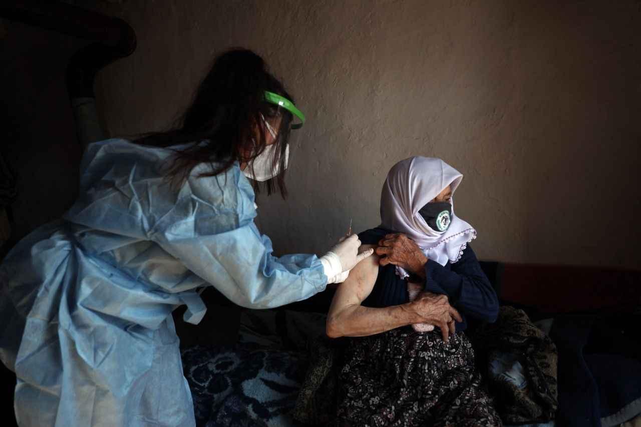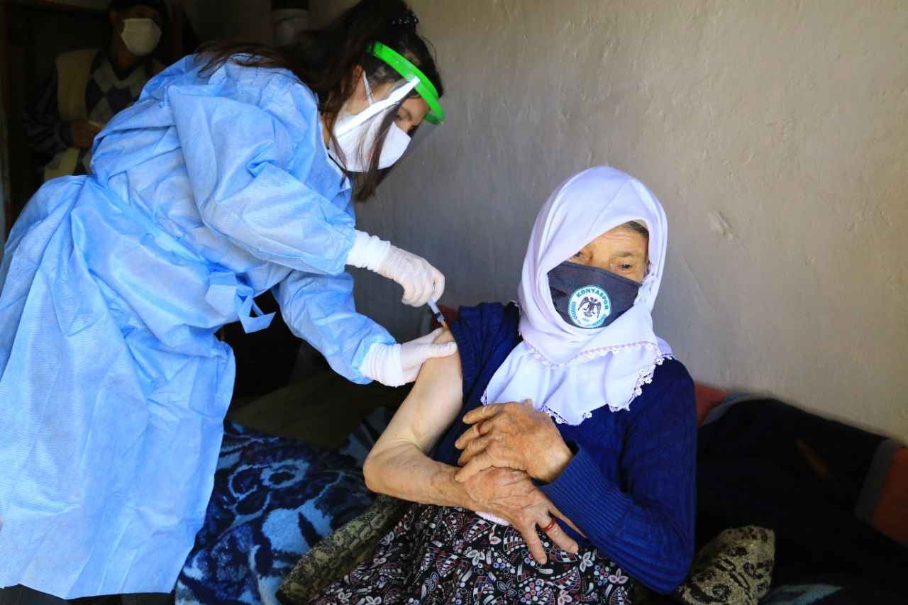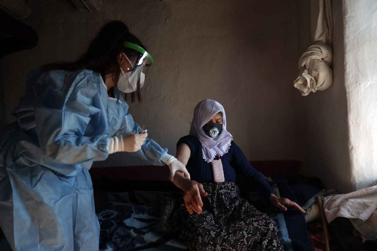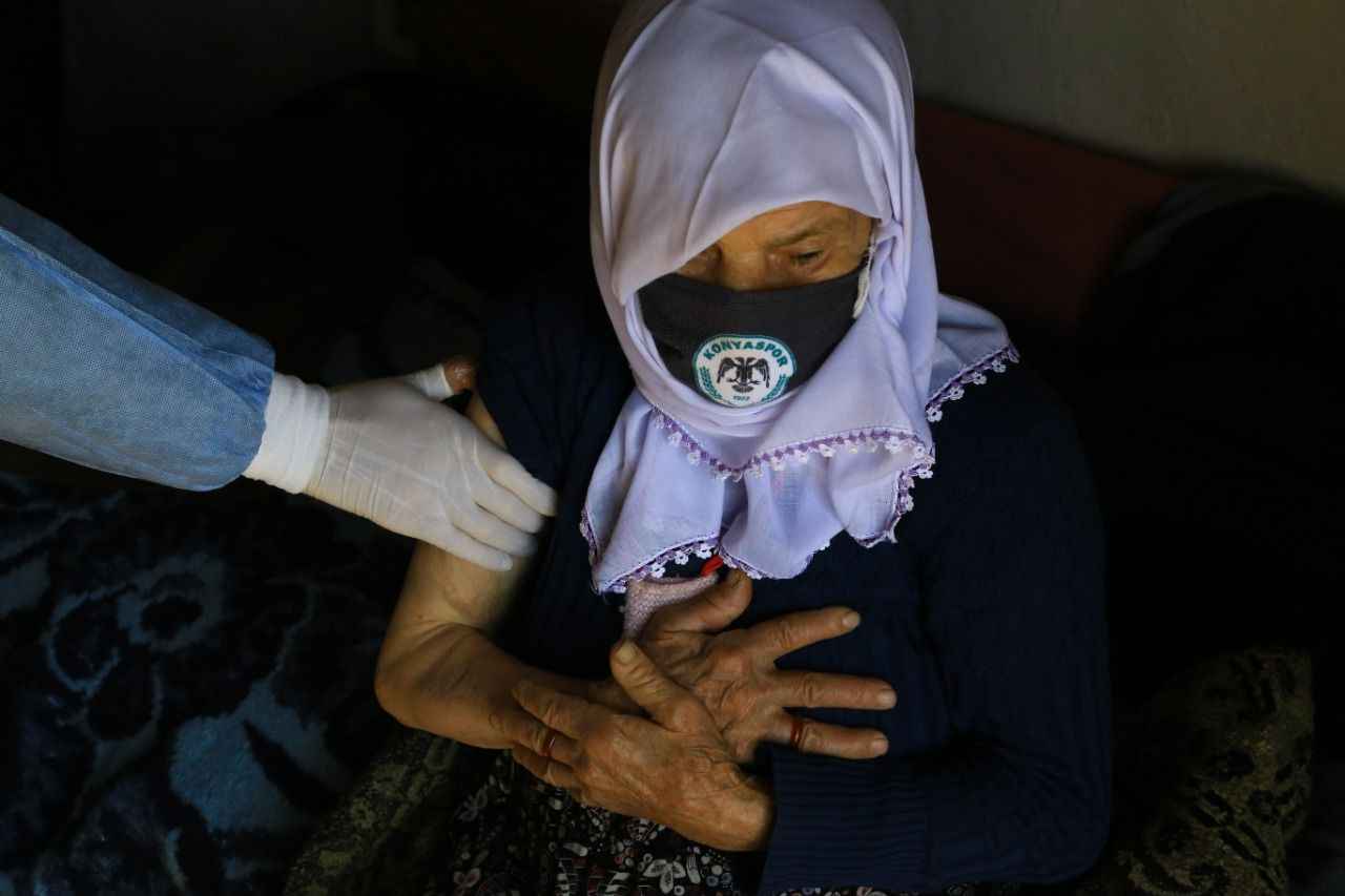Yaşlı kadın, kendisini aşılayan sağlık ekibine şefkatli gözlerle baktı. Ekip üyelerinin ellerini bırakmayan Kara, devletin kendisine sunduğu bu imkan nedeniyle yetkililere teşekkür etti.