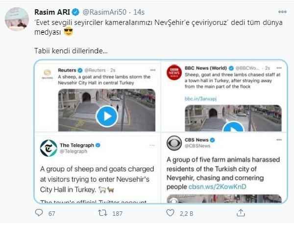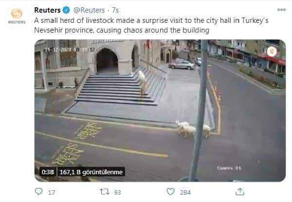 Öte yandan sosyal medyadan haberi paylaşan Reuters Haber Ajansı, "Belediye başkanı nerede? Türkiye'de bir koyun, bir keçi ve üç kuzu Nevşehir belediye binasına baskın düzenledi" ifadelerine yer verdi.