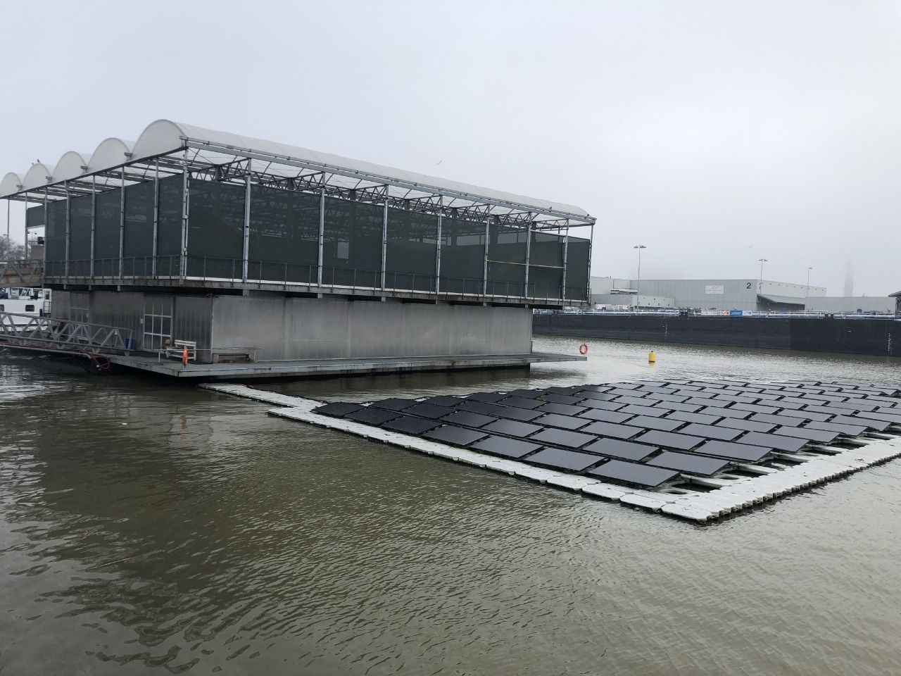 Yüzen çiftliğin hemen yanında yüzen bir güneş paneli bulunuyor. Bu panelden elde edilen enerji, çiftliğin ihtiyacını önemli ölçüde karşılıyor.