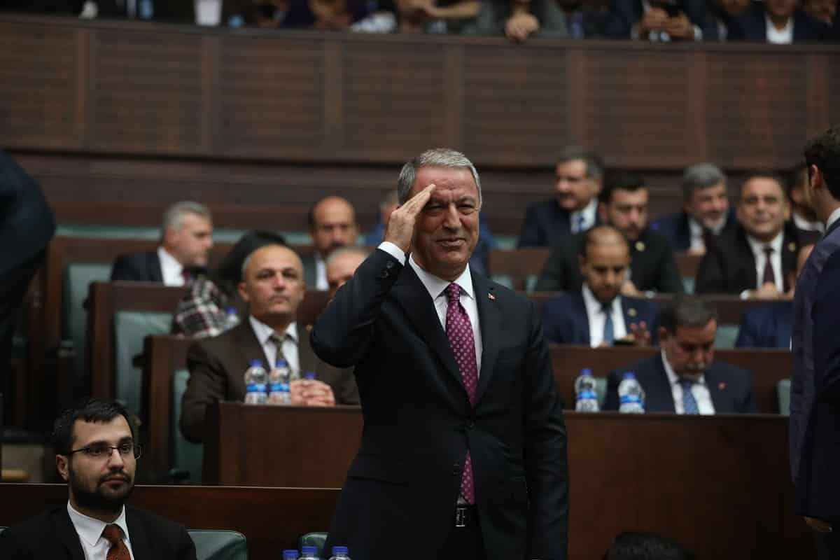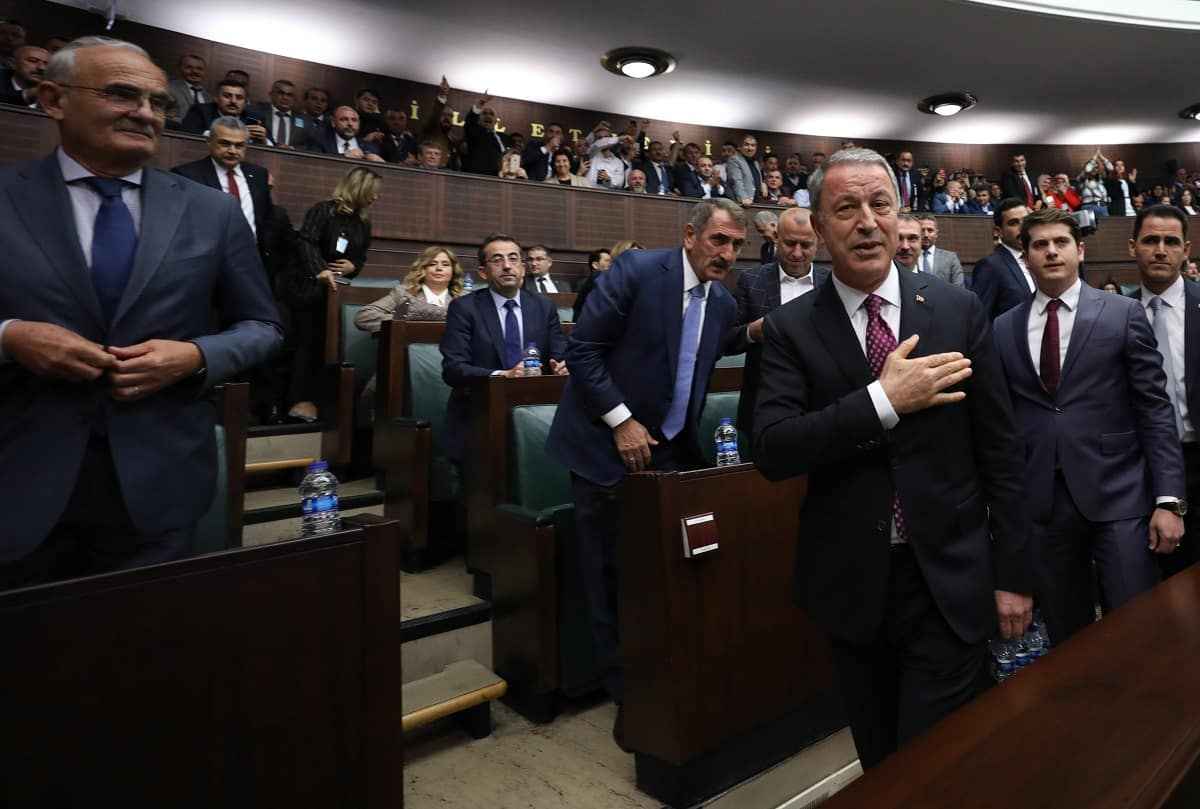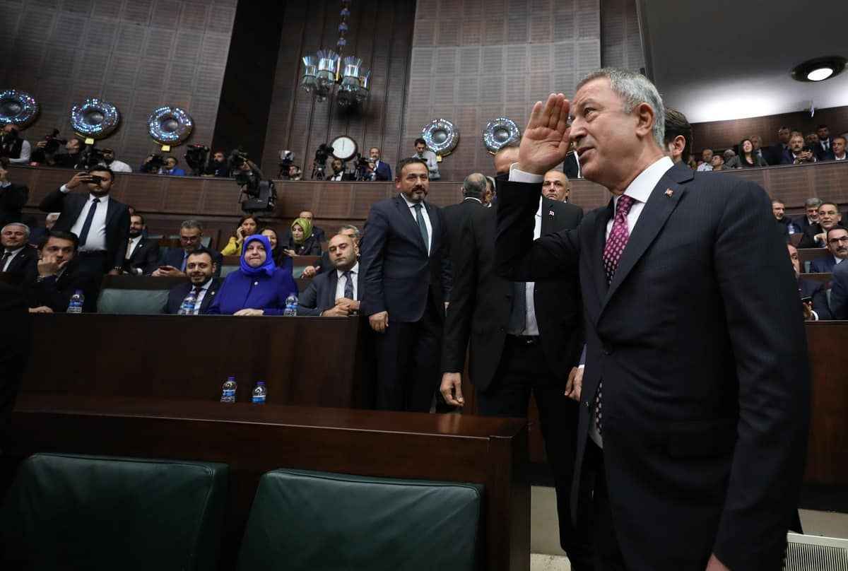 AK Parti Grup Toplantısı öncesi AK Partililer, Milli Savunma Bakanı Hulusi Akar'ı "Her Türk asker doğar", "Hulusi baba bizi Suriye'ye götür", "Türkiye seninle gurur duyuyor" sloganları ile karşıladı.