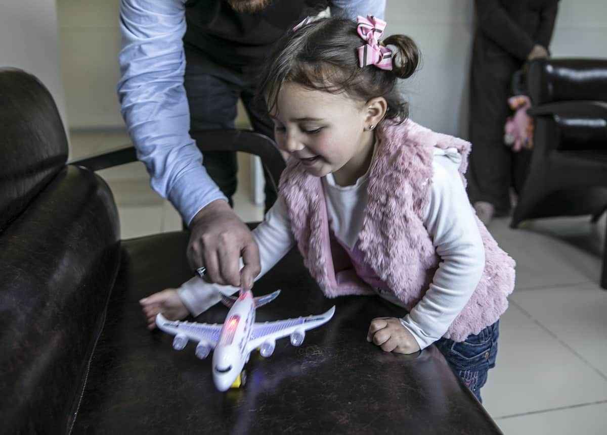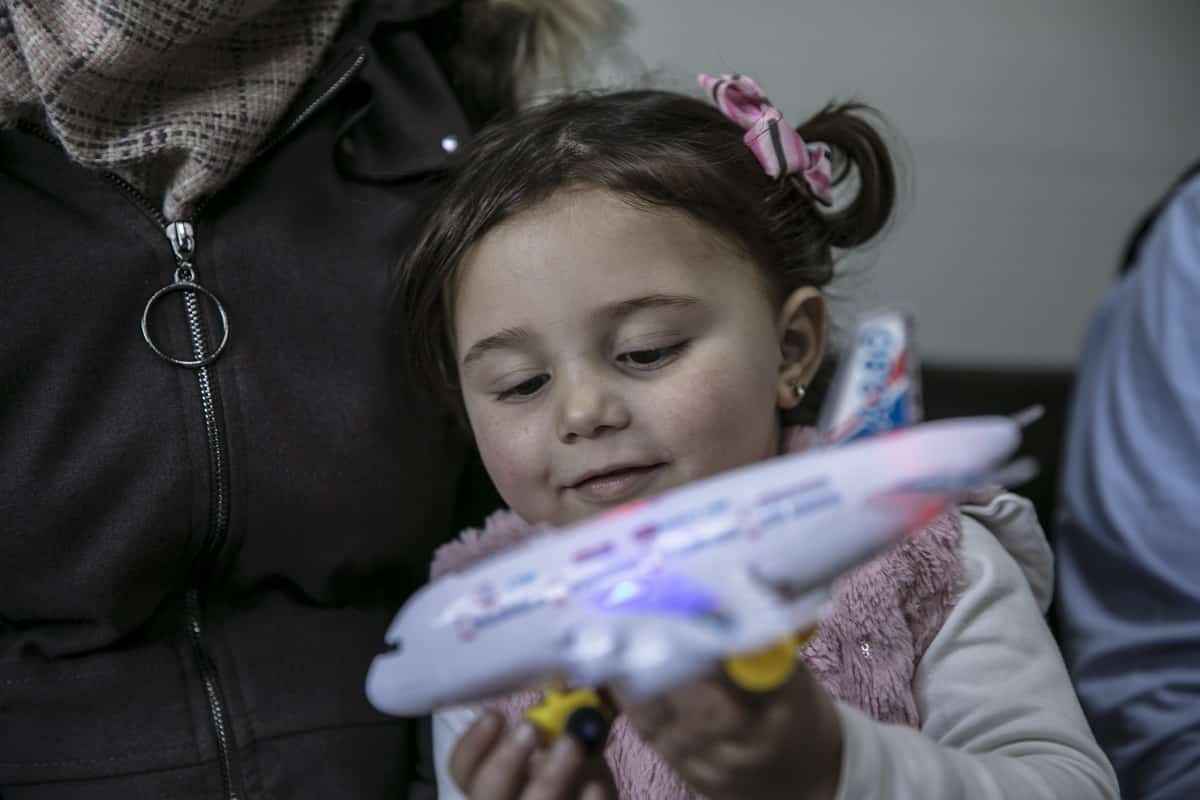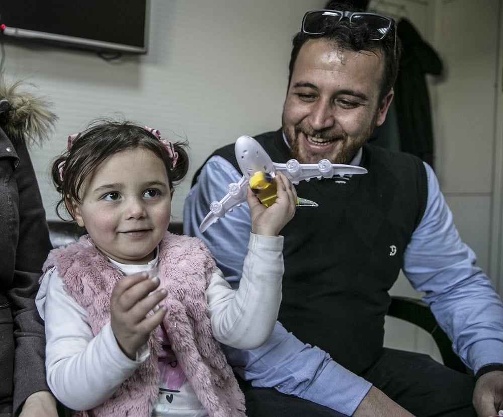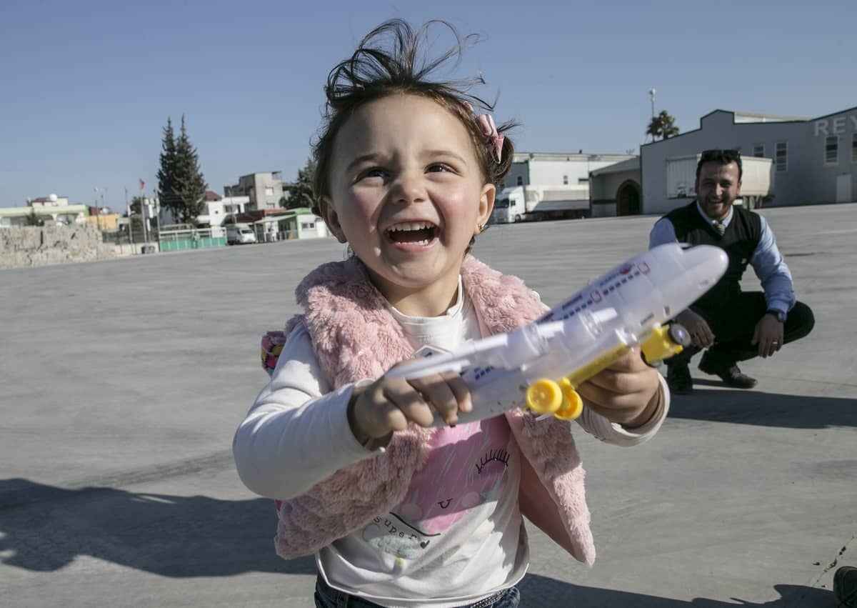 İdlib'deki bombardımanlardan korkmaması için babasının "savaş oyunu" oynattığı küçük Selva da kendisine alınan oyuncak uçakla oynadı, yiyeceklerden tattı.