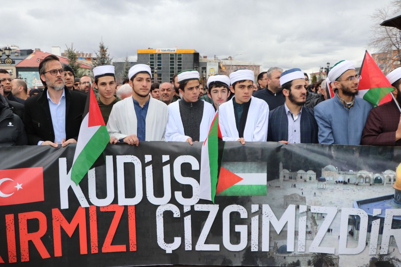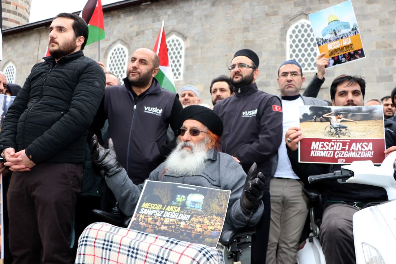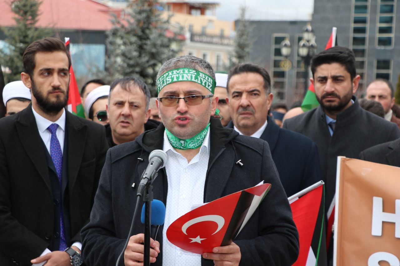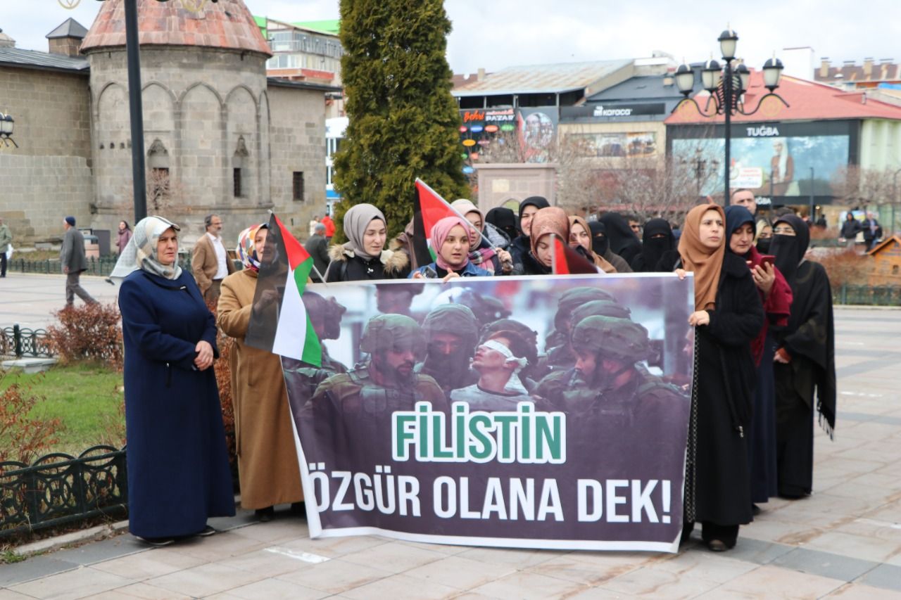 Erzurum'da cuma namazı sonrası Lalapaşa Camisi'nin bahçesinde ellerinde Filistin bayrakları ve pankartlarla bir araya gelen sivil toplum kuruluşu temsilcileri, dernek üyeleri ve vatandaşlar, İsrail'in saldırılarını lanetledi.