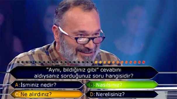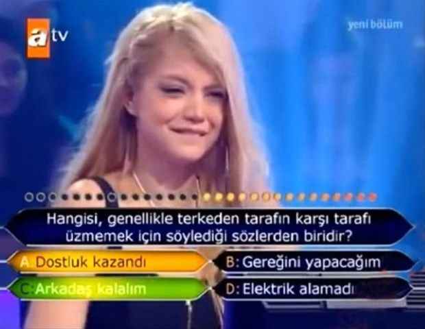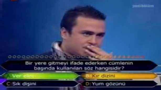 Ünlü oyuncu Eray Demirkol ilk soruda elenen isimlerden birisi. Gelen soruda heyecan yapmış olacak ki, yüz ifadesinden de anlaşılacağı üzerine şıklar arasında kararsız kalmış. A şıkkı “Ver elini” şıkkı doğruyken B şıkkını tercih etmiş. Haliyle ilk soruda elendi kendisi.
