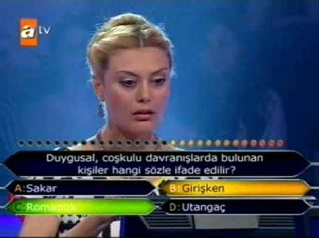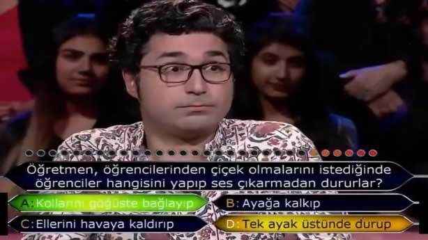 İlkokulda sıklıkla karşılaştığımız durumu yarışmacı unutmuş olacak ki yanlış cevap verdi. “Çiçek olun” denildiğinde kollar birleştirilir, dikkatlice öğretmen dinlenirdi. Yapacak bir şey yok, ilk soruda elendi tabii yarışmacı.