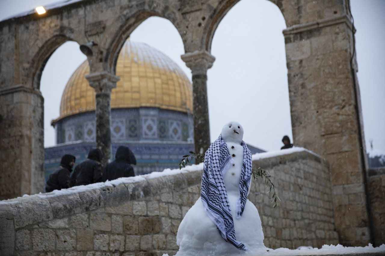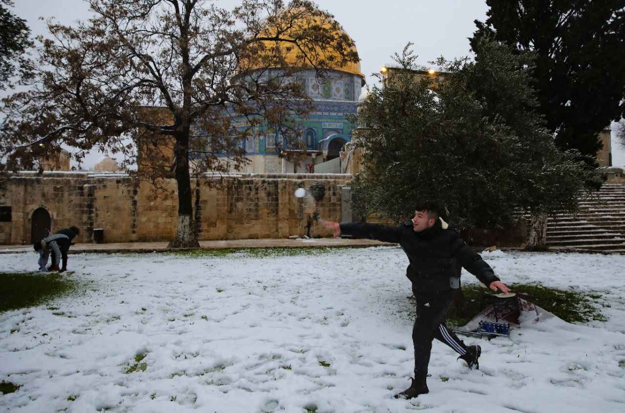 Mescid-i Aksa'nın da içinde yer aldığı Eski Şehir'in Şam Kapısı önünde toplanan Filistinliler kar topu oynayarak eğlendi.