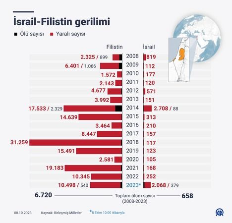 İsrail merkezli Kanal 12 televizyonunun haberine göre de İzzeddin el-Kassam Tugaylarının abluka altındaki Gazze Şeridi'nden İsrail'e başlattığı "Aksa Tufanı" saldırısında ölü sayısı 350'ye çıktı.