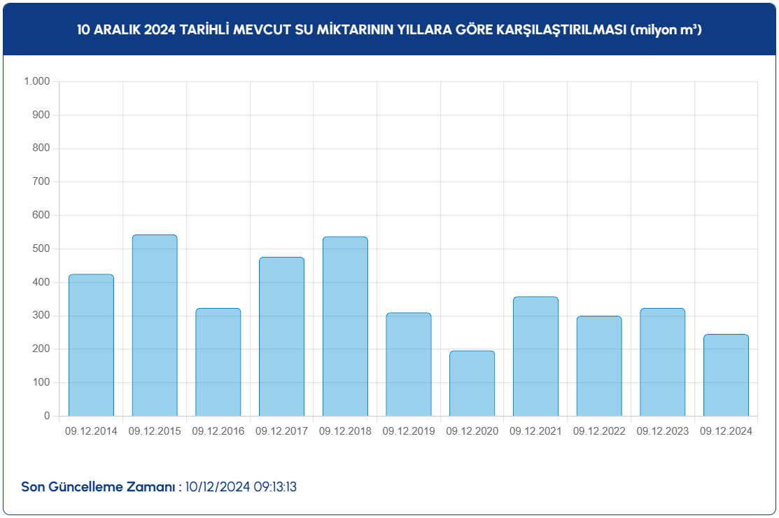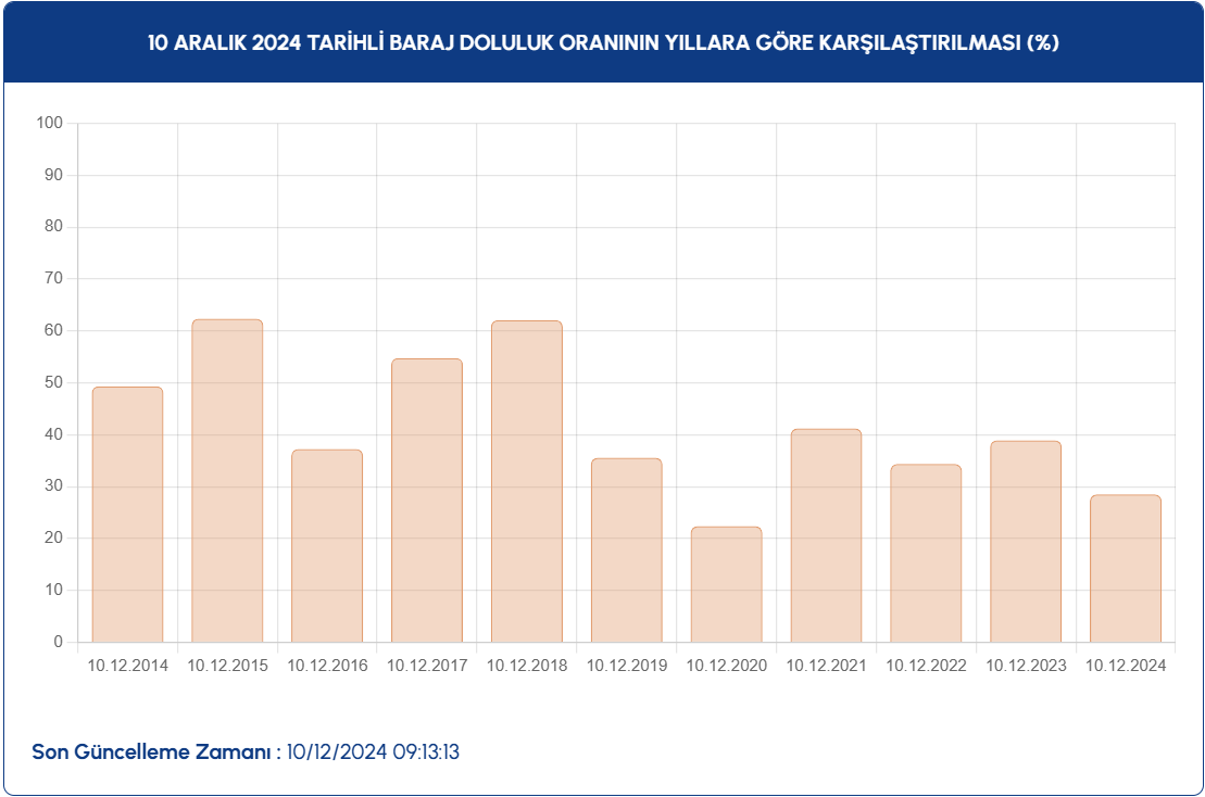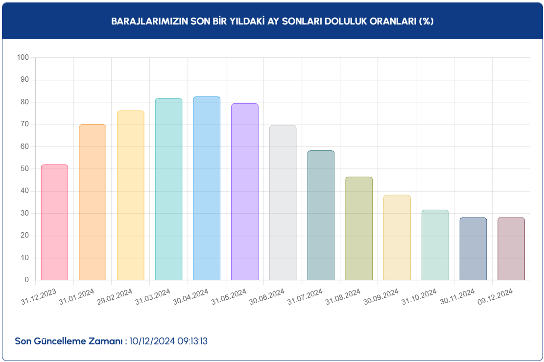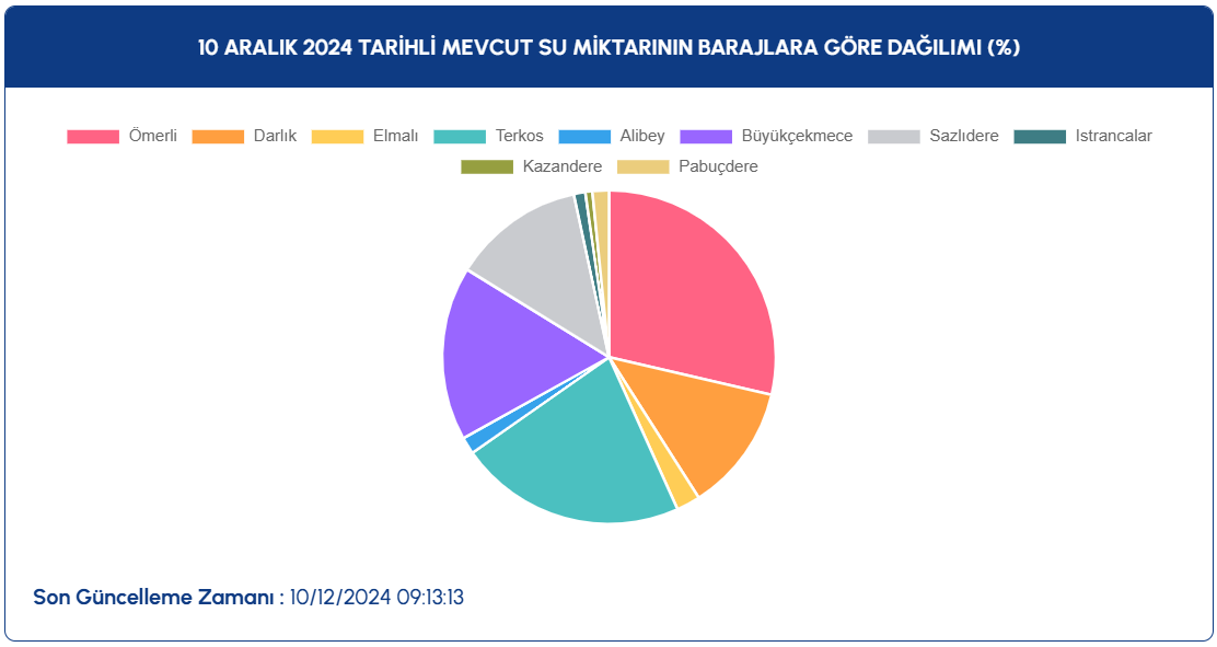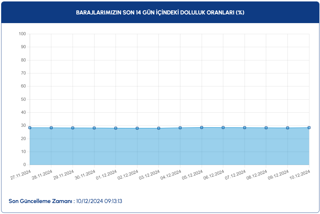 İstanbul Su ve Kanalizasyon İdaresi (İSKİ) verilerine göre, İstanbul'a su sağlayan barajların doluluk oranı yüzde 28.52 oldu. Bu rakam genel olarak düşük görünse de, 2 Aralık'ta 28.05 olarak ölçülen değerin ardından doluluk oranında bir artış gözlemlendi.