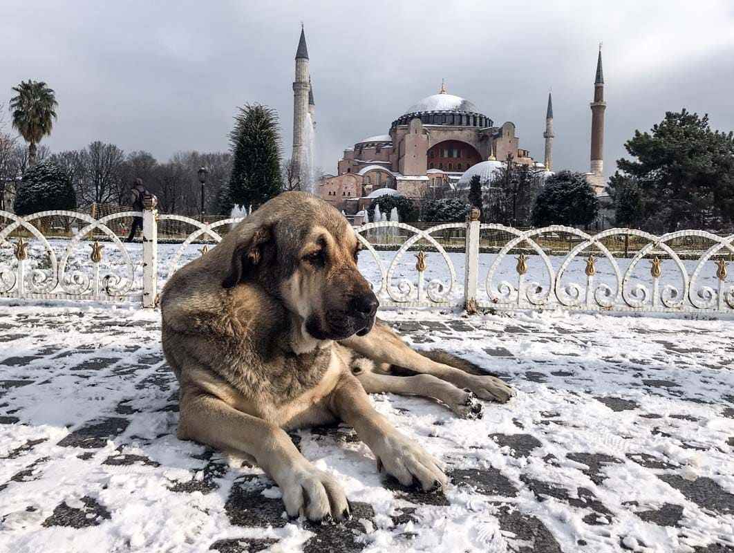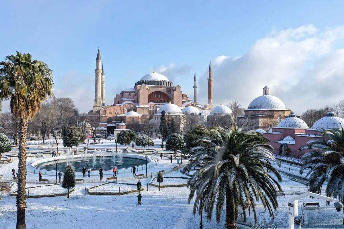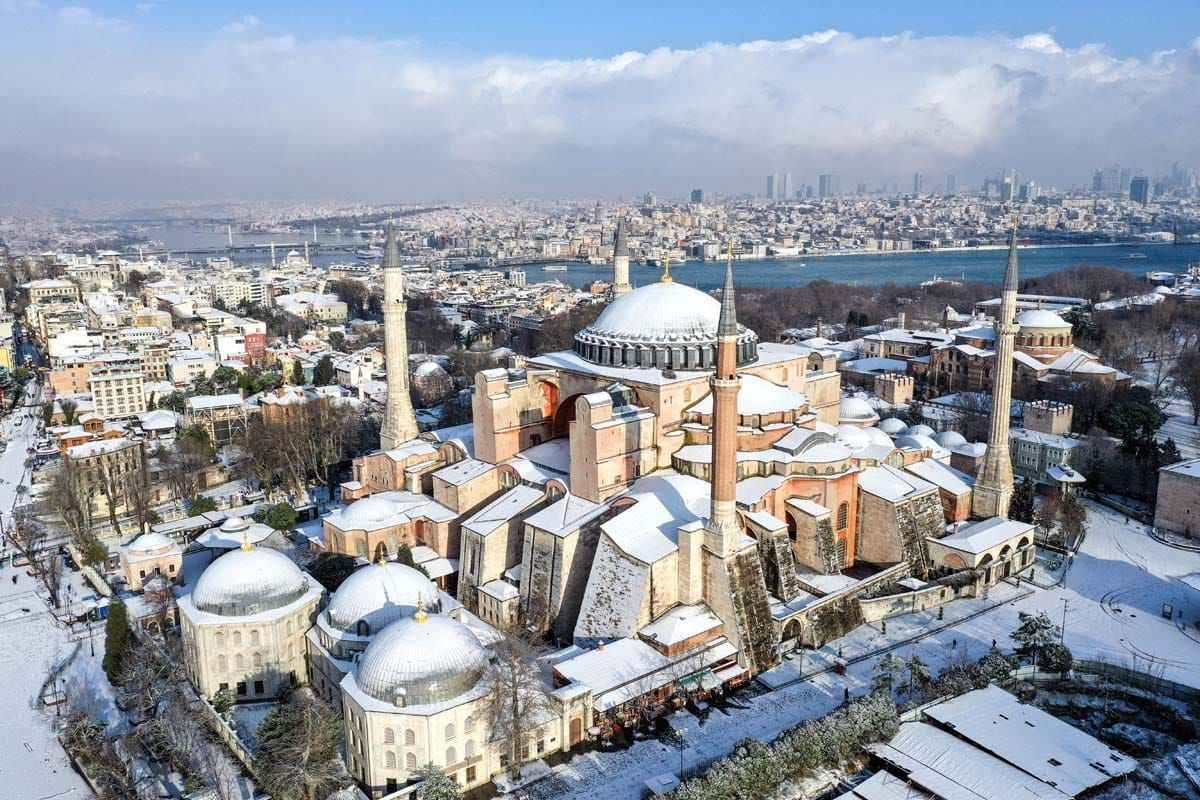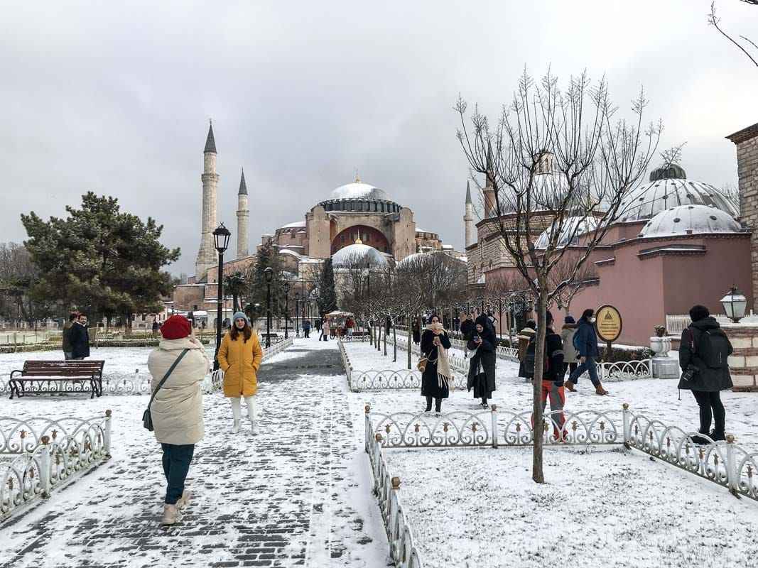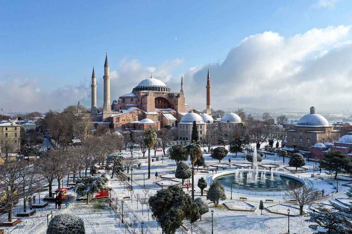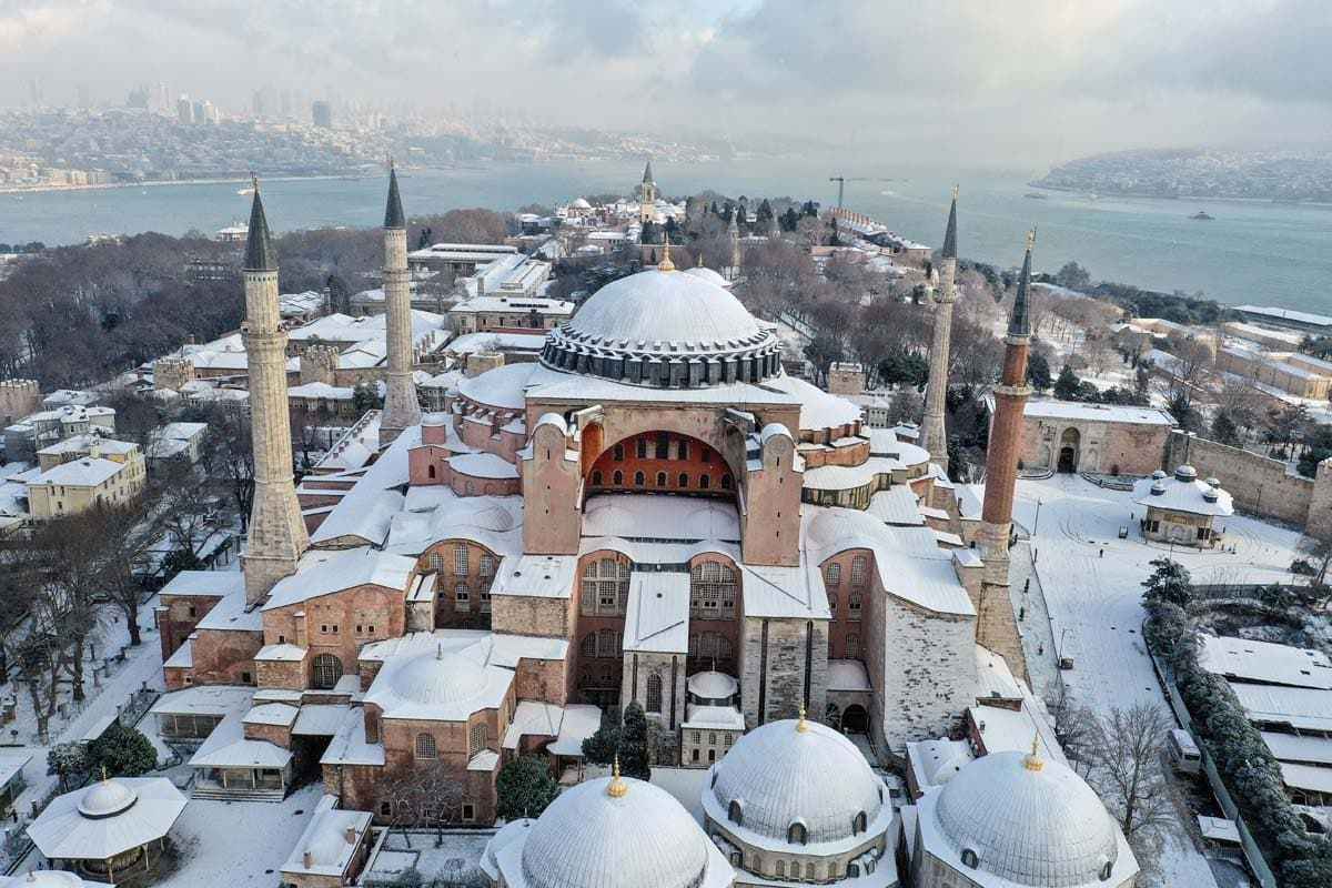 Erken saatlerde yağan kar, Ayasofya Camii'ne de beyaz gelinliğini giydirdi.