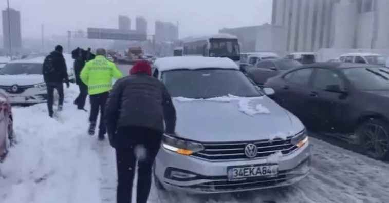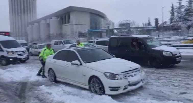 BAĞCILAR TEM Bağlantı Yolu İSTOÇ mevkiinde kar nedeniyle yolda kalan araçları polisler iterek kurtardı.