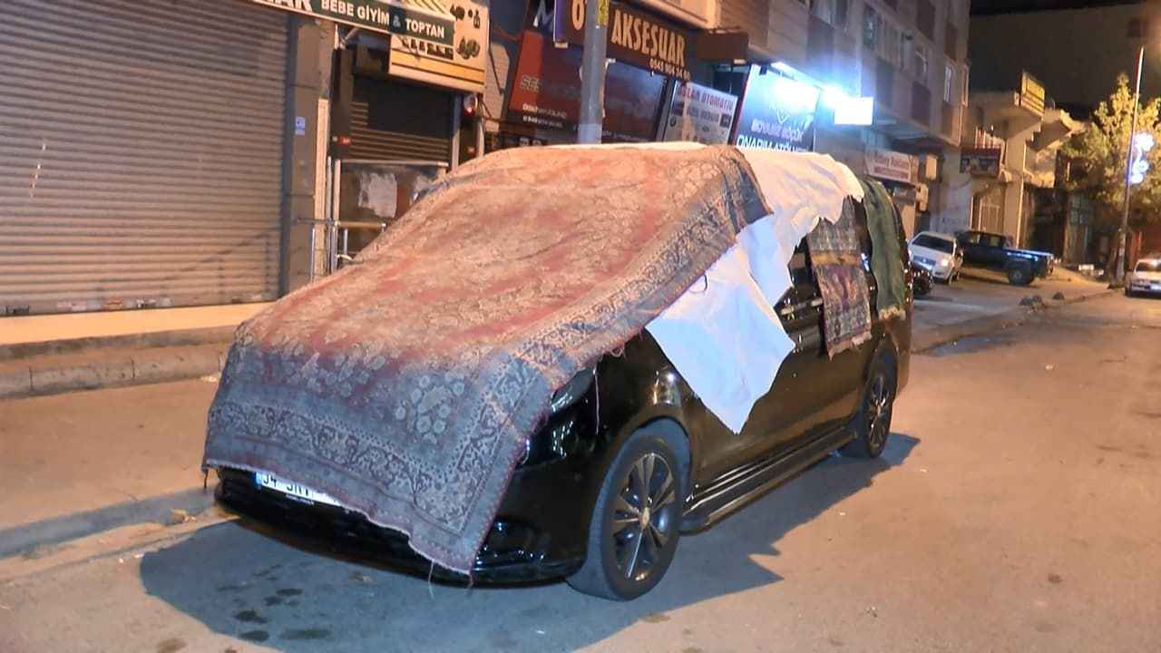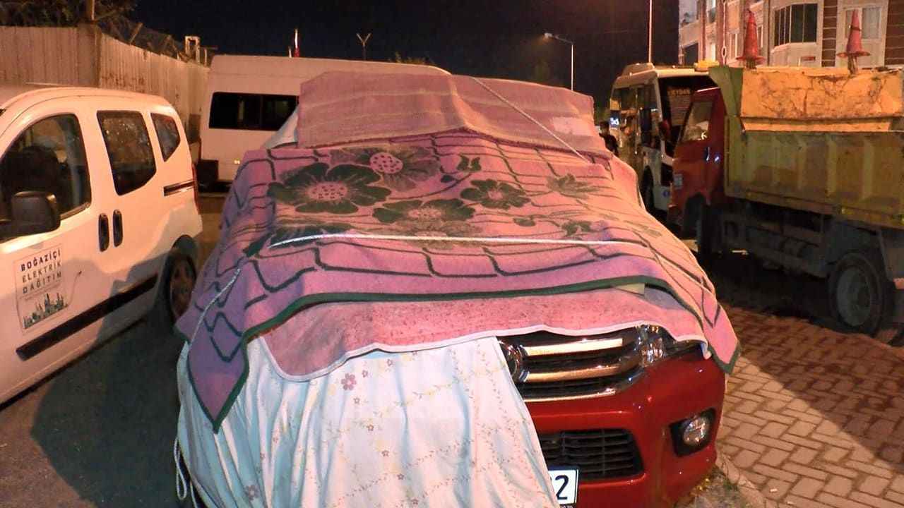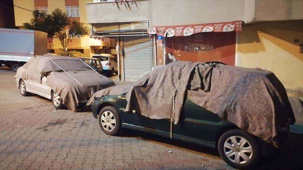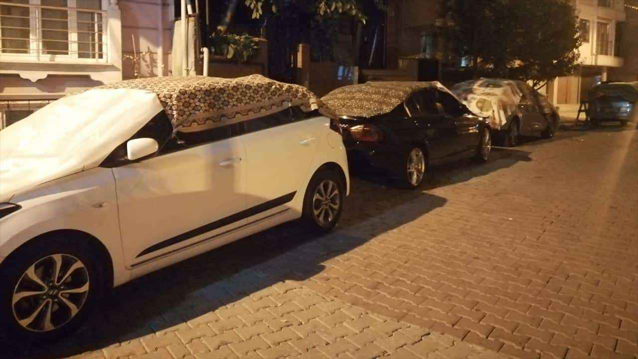 Evlerinden getirdikleri battaniye, branda, halı ve aldıkları inşaat malzemeleri ile araçlarının üzerini kapatan vatandaşlar, doluya karşı önlem almaya çalıştı.