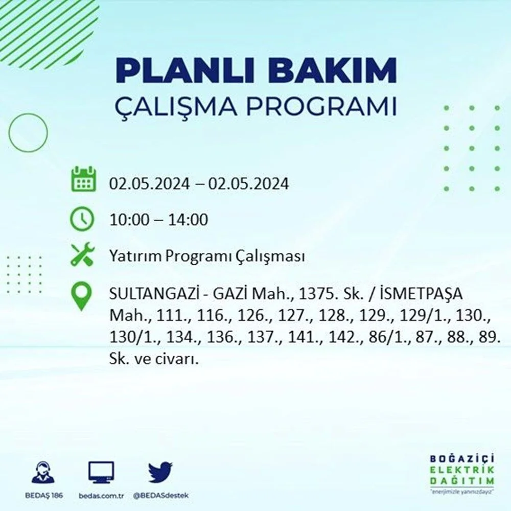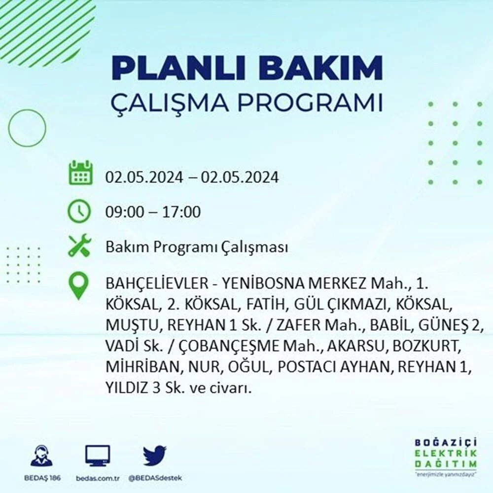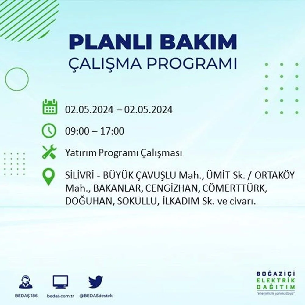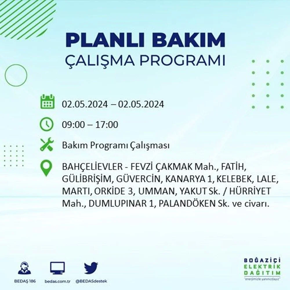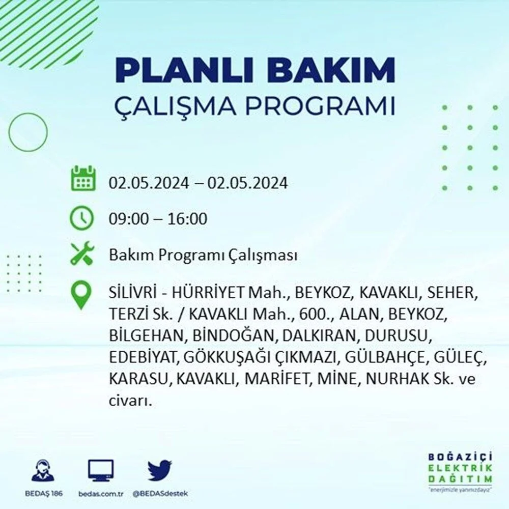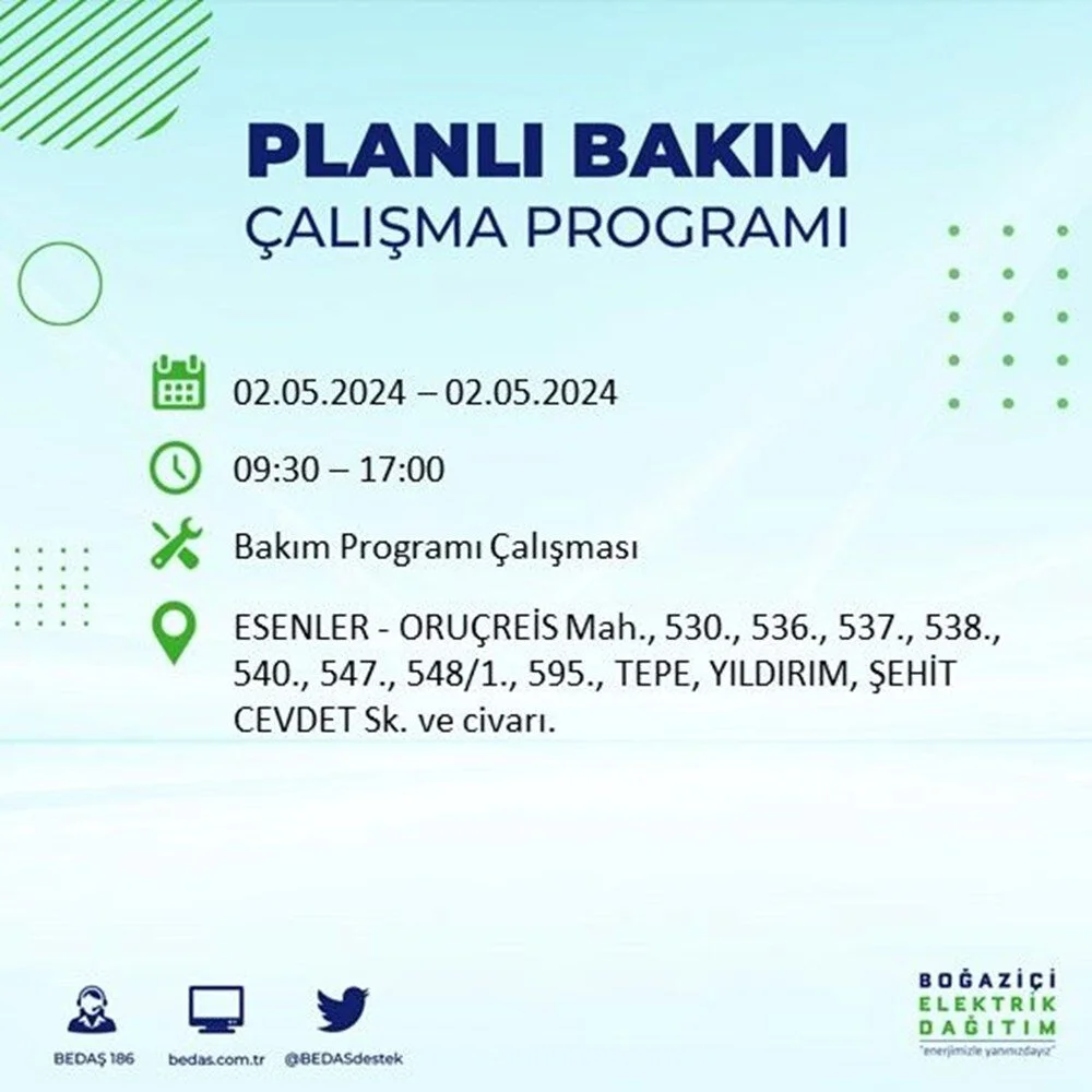 Boğaziçi Elektrik Dağıtım A.Ş (BEDAŞ), İstanbul'un 18 ilçesinde bugün elektrik kesintisi yapılacağını açıkladı. BEDAŞ tarafından yayımlanan planlı kesinti programına göre, Arnavutköy, Avcılar, Bağcılar, Bahçelievler, Başakşehir, Beşiktaş, Beylikdüzü'nün de aralarında bulunduğu birçok ilçede bugün planlı çalışma kapsamında elektrik kesintisi yaşanacak. Peki, elektrikler ne zaman gelecek? İşte 2 Mayıs 2024 tarihli BEDAŞ elektrik kesintisi listesi.