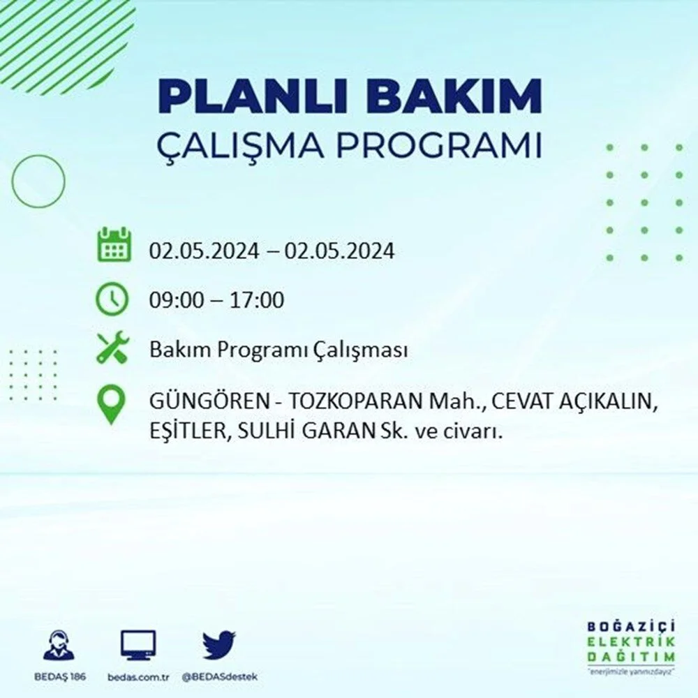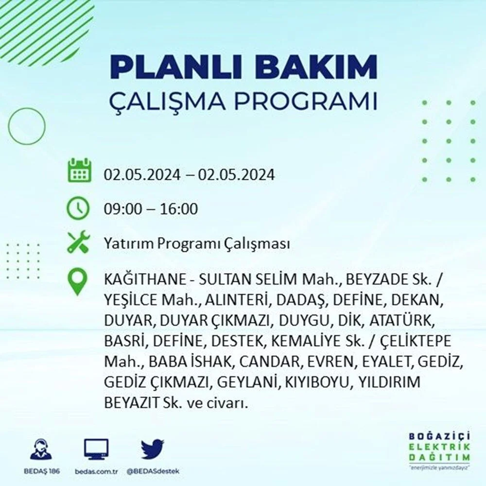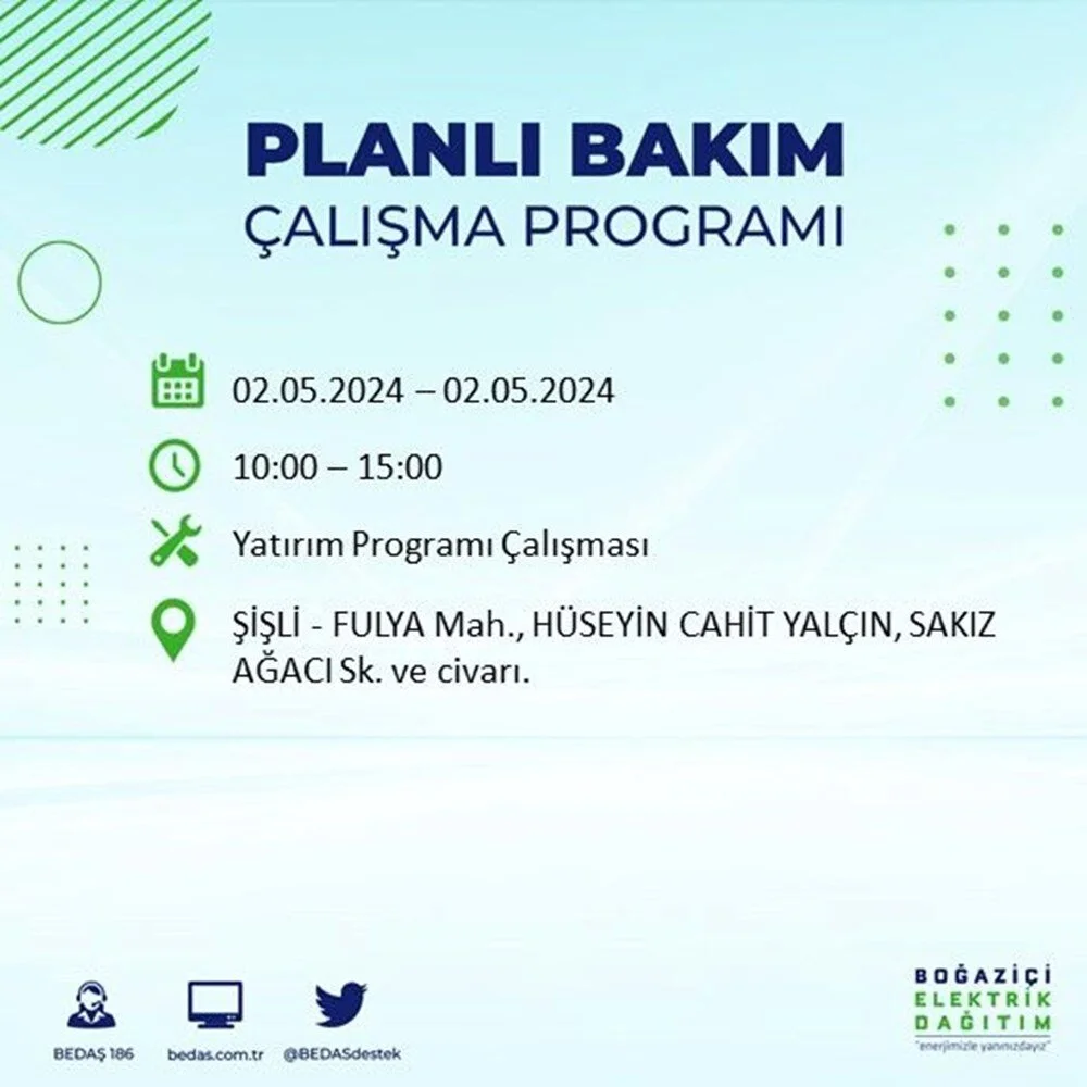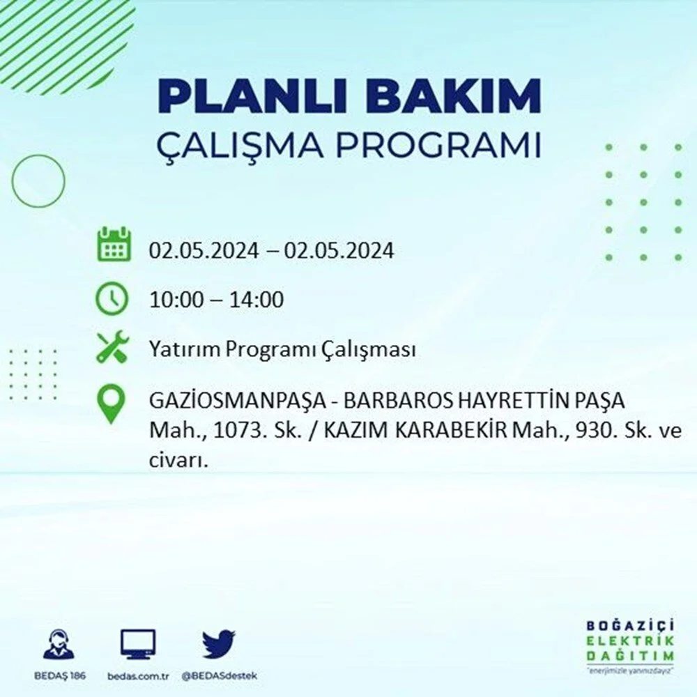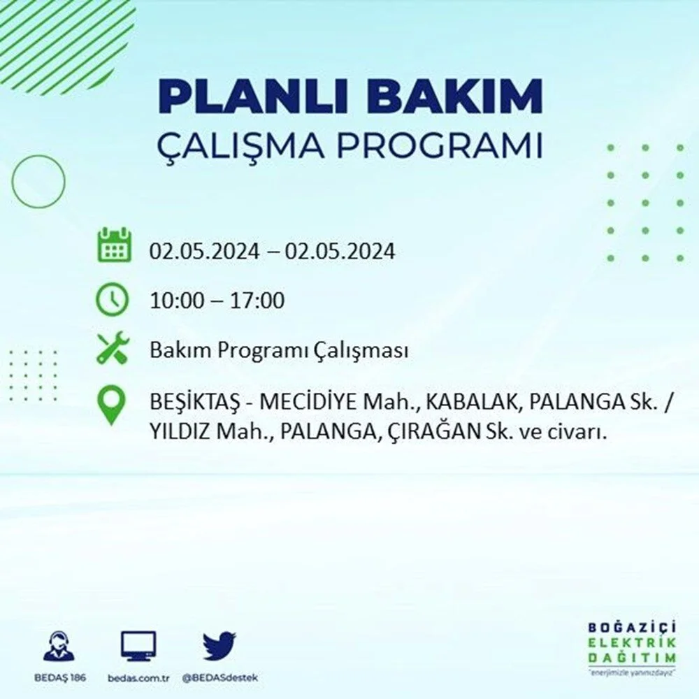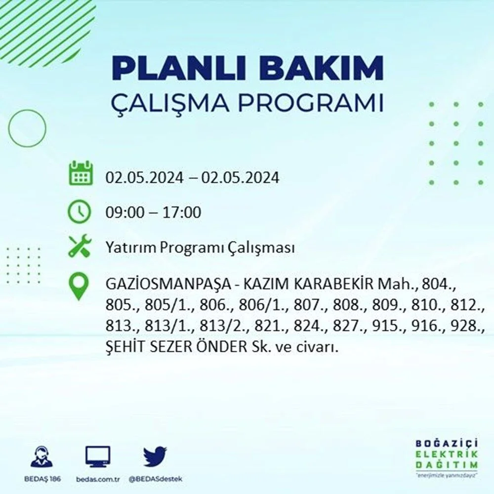 Boğaziçi Elektrik Dağıtım A.Ş (BEDAŞ), İstanbul'un 18 ilçesinde bugün elektrik kesintisi yapılacağını açıkladı. BEDAŞ tarafından yayımlanan planlı kesinti programına göre, Arnavutköy, Avcılar, Bağcılar, Bahçelievler, Başakşehir, Beşiktaş, Beylikdüzü'nün de aralarında bulunduğu birçok ilçede bugün planlı çalışma kapsamında elektrik kesintisi yaşanacak. Peki, elektrikler ne zaman gelecek? İşte 2 Mayıs 2024 tarihli BEDAŞ elektrik kesintisi listesi.
