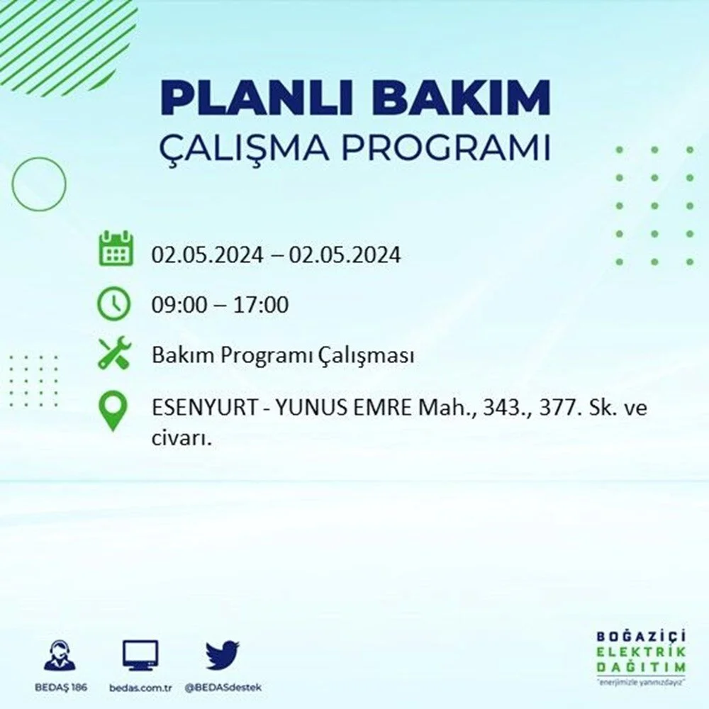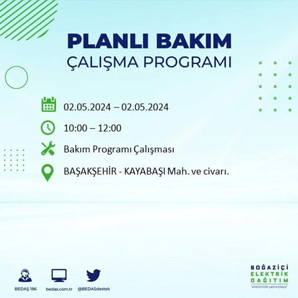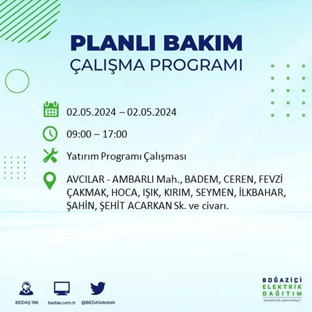 Arnavutköy, Avcılar, Bağcılar, Bahçelievler, Başakşehir, Beşiktaş, Beylikdüzü'nün de aralarında bulunduğu birçok ilçede bugün planlı çalışma kapsamında elektrik kesintisi yaşanacak.