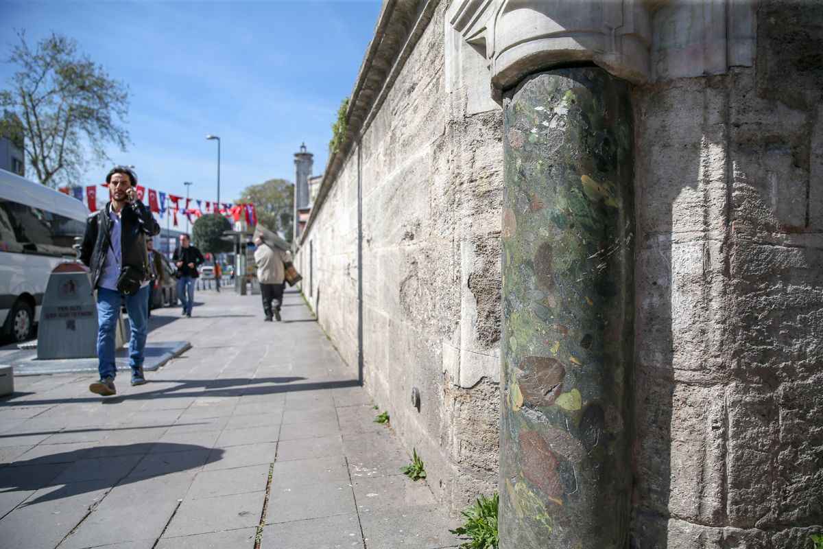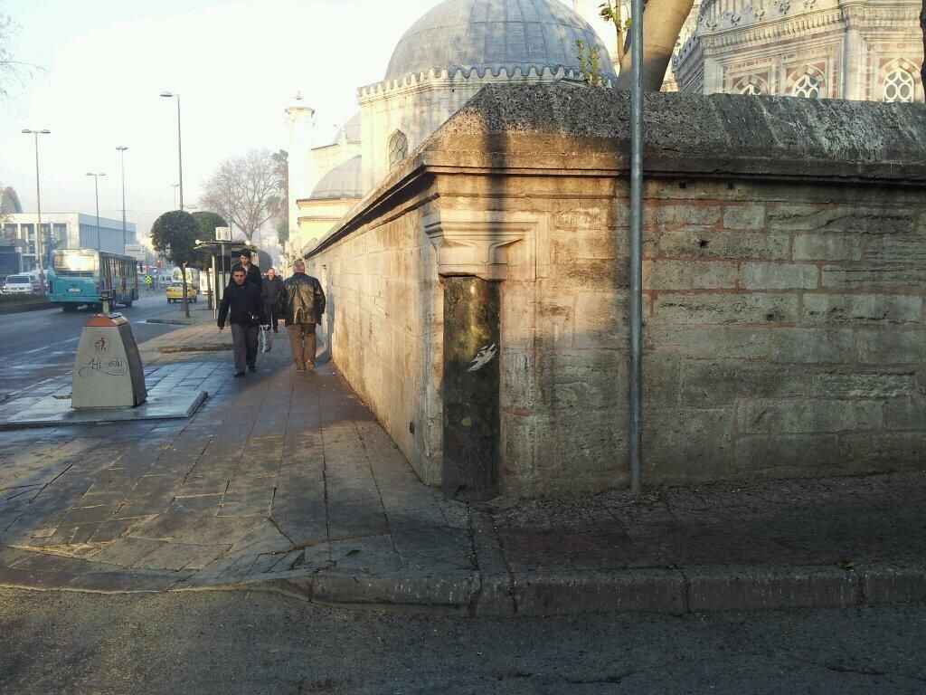 Şehzadebaşı külliyesinin Vezneciler Caddesine bakan avlu duvarının, Damat İbrahim Paşa Camii ile komşu olan köşesinde bulunan yeşil mermer sütun bulunur.