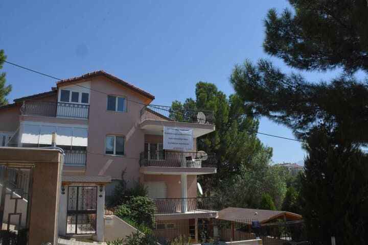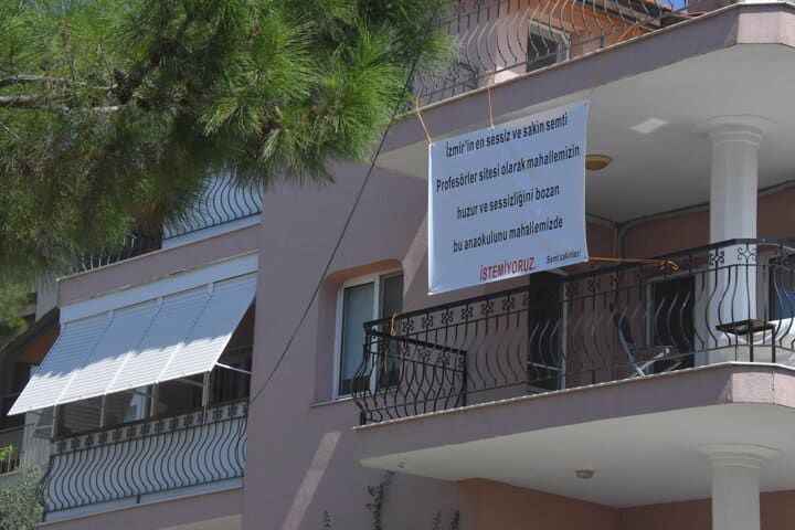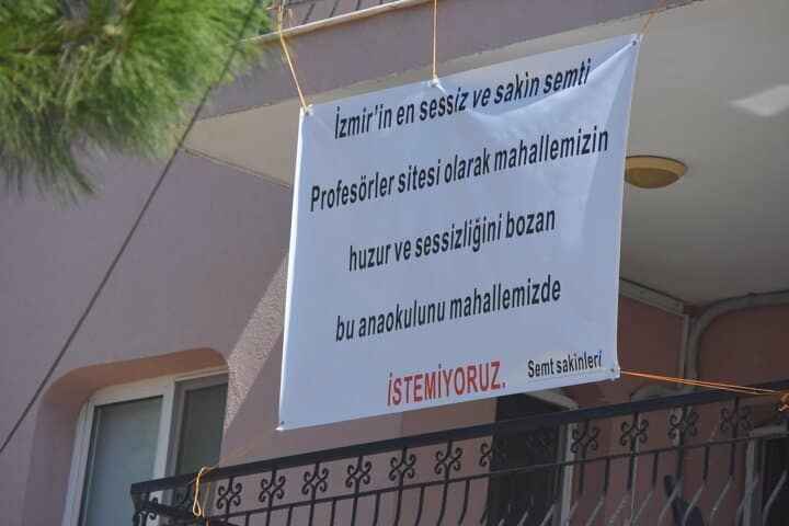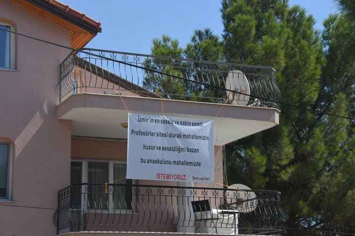 Tepkisini dile getirmek için de balkonuna, üzerinde, 'İzmir'in en sessiz ve sakin semti Profesörler Sitesi olarak mahallemizin huzur ve sessizliğini bozan bu anaokulunu mahallemizde istemiyoruz' yazılı pankartı astı.