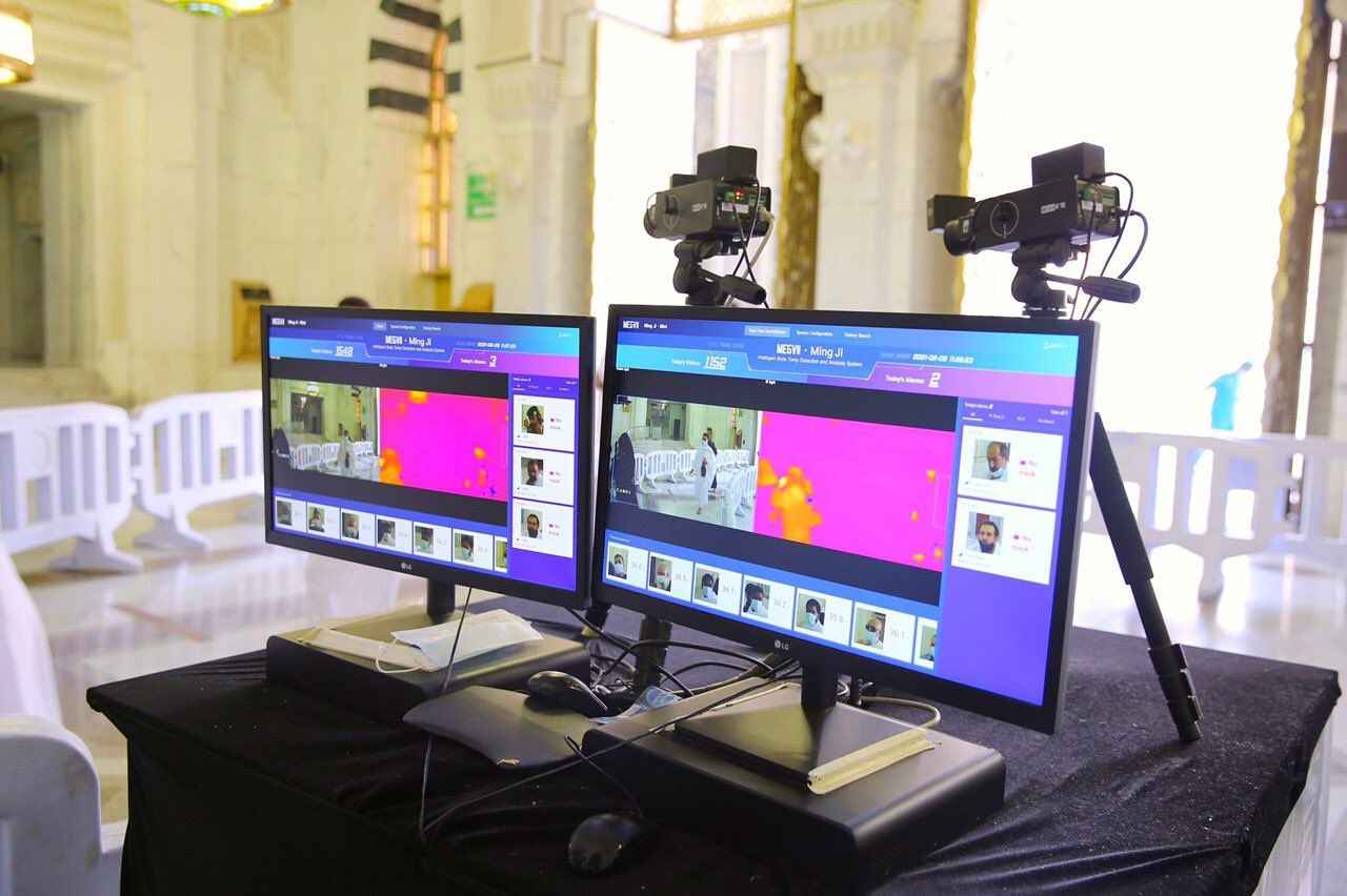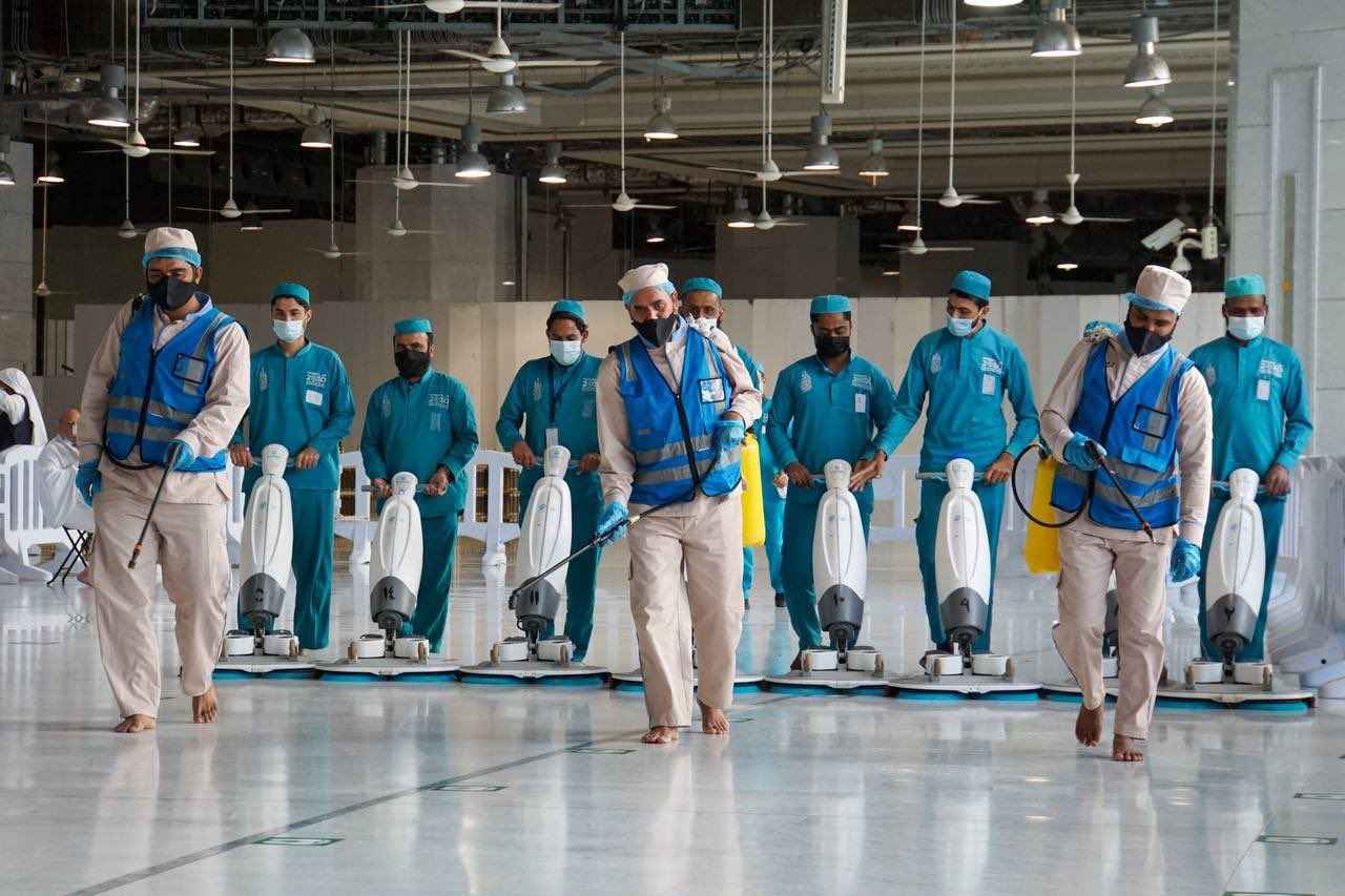 300'den fazla otomatik el sterilizasyonu konulan Kabe ve çevresinde yüzlerce temizlik görevlisi sahada dikkatli bir şekilde çalışıyor.