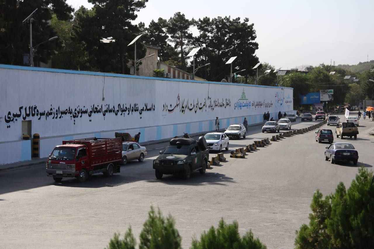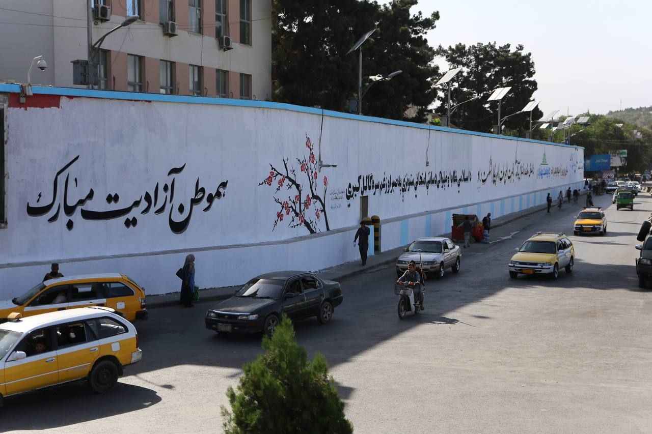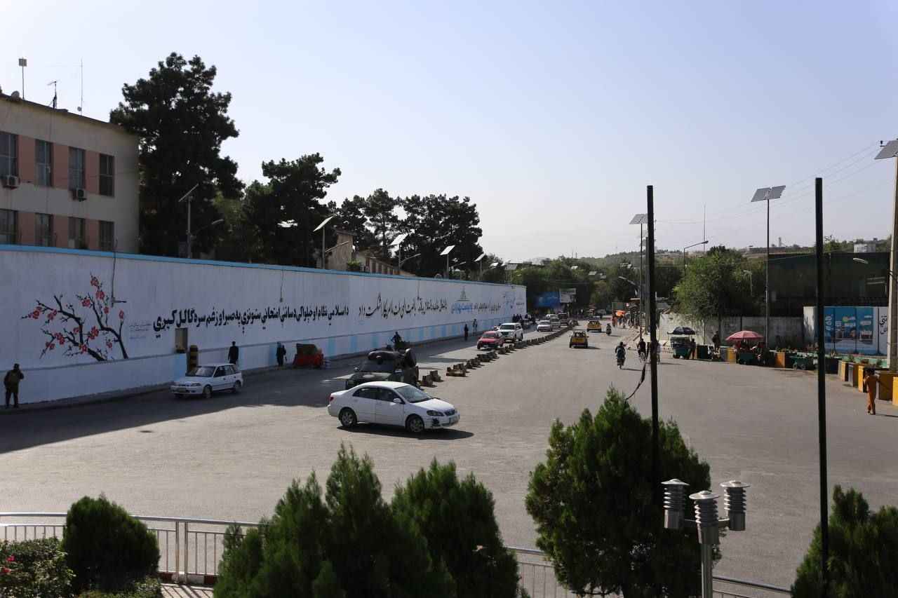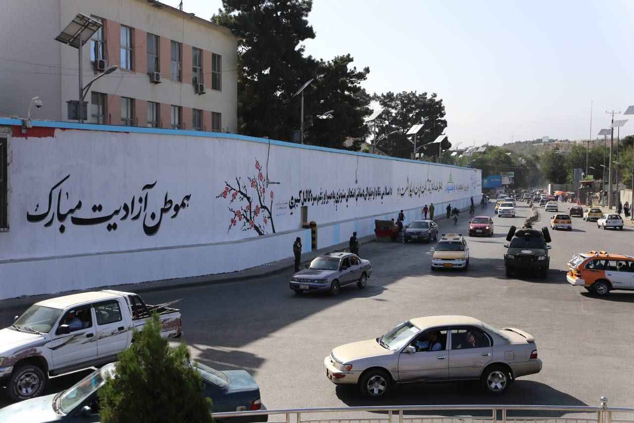 Kabil'deki Hamid Karzai Uluslararası Havalimanı'na giden ana cadde üzerindeki Mesud kavşağı üzerinde bulunan ABD'nin Kabil Büyükelçiliğinin duvarları önce beyaza boyandı sonra Taliban lehine yazı ve motiflerle süslendi.