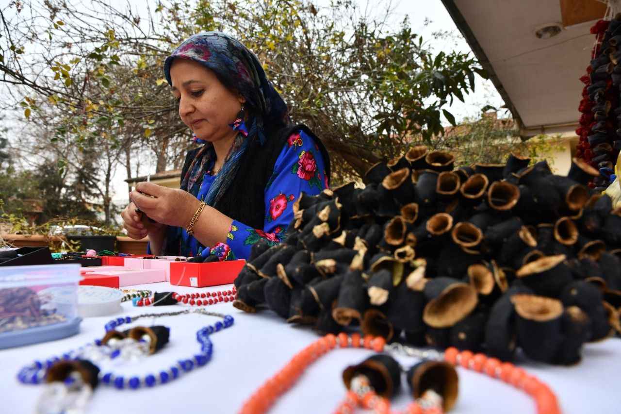 Türkkan, patlıcanın kurusundan elde ettiği birbirinden renkli küpeleri, hediyelik eşya olarak internet üzerinden satışa sunarak ev ekonomisine katkı sağlıyor.