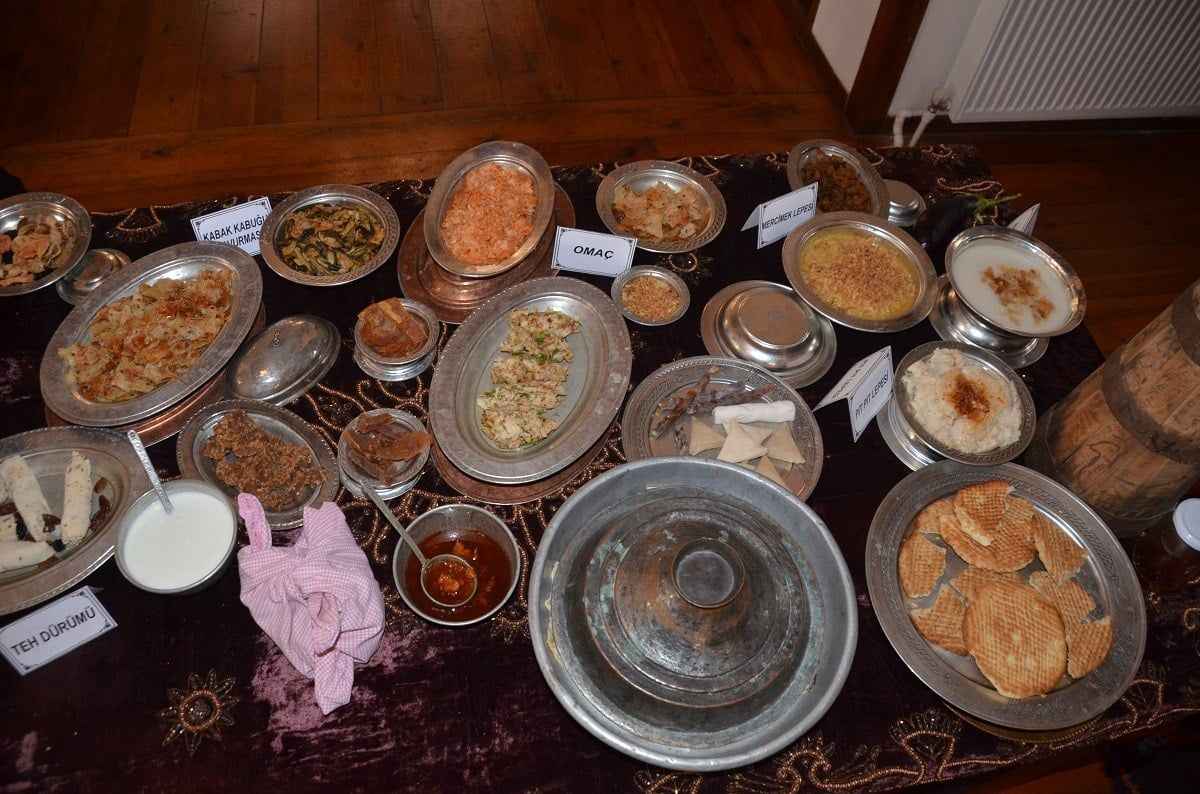 Türkolog Sibel Topçuoğlu Dedeoğlu'nun merkez Dulkadiroğlu ilçesindeki Kocabaş Konağı'nda gerçekleştirdiği sergide, yaklaşık 15 çeşit yöresel yemek yer aldı.