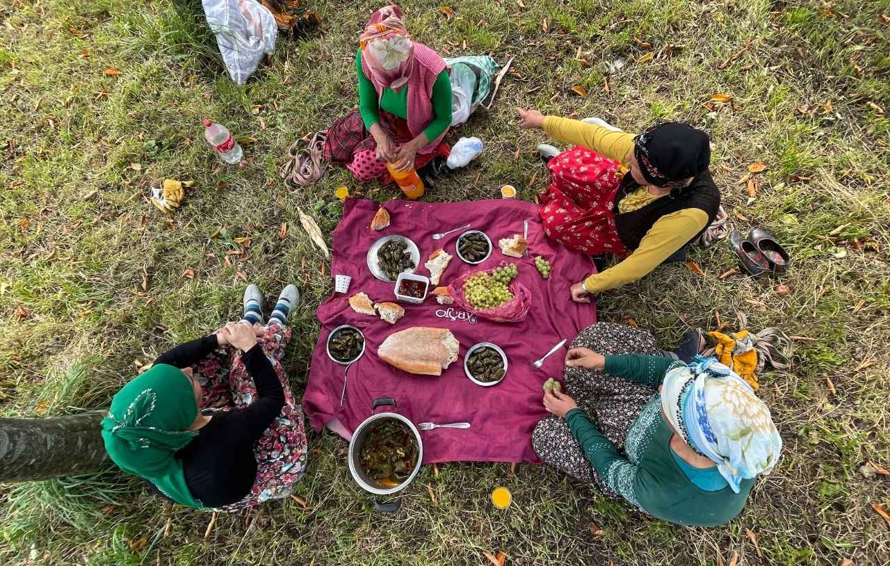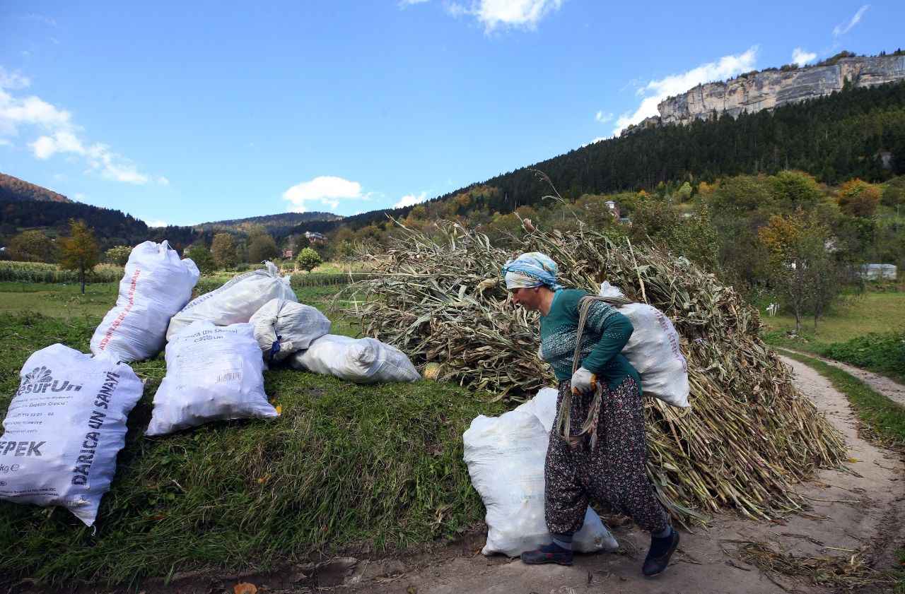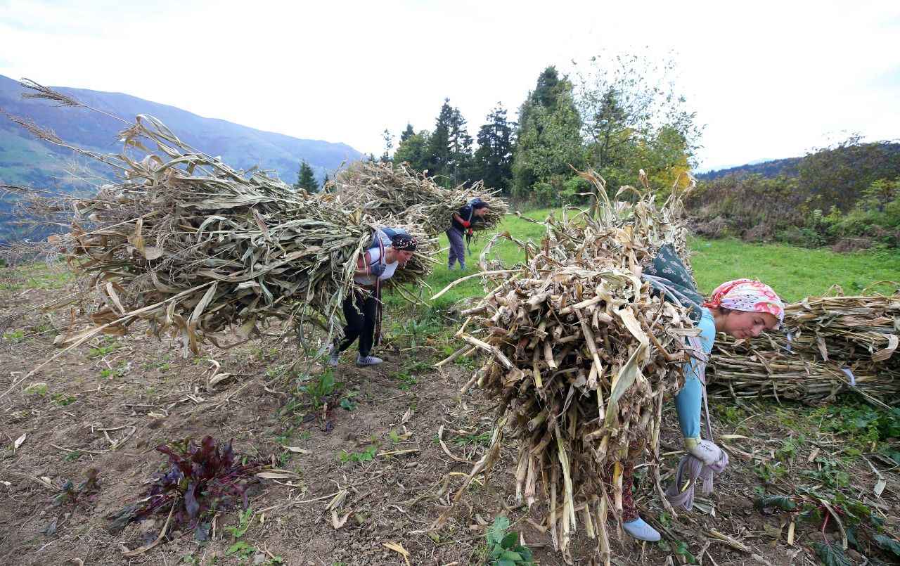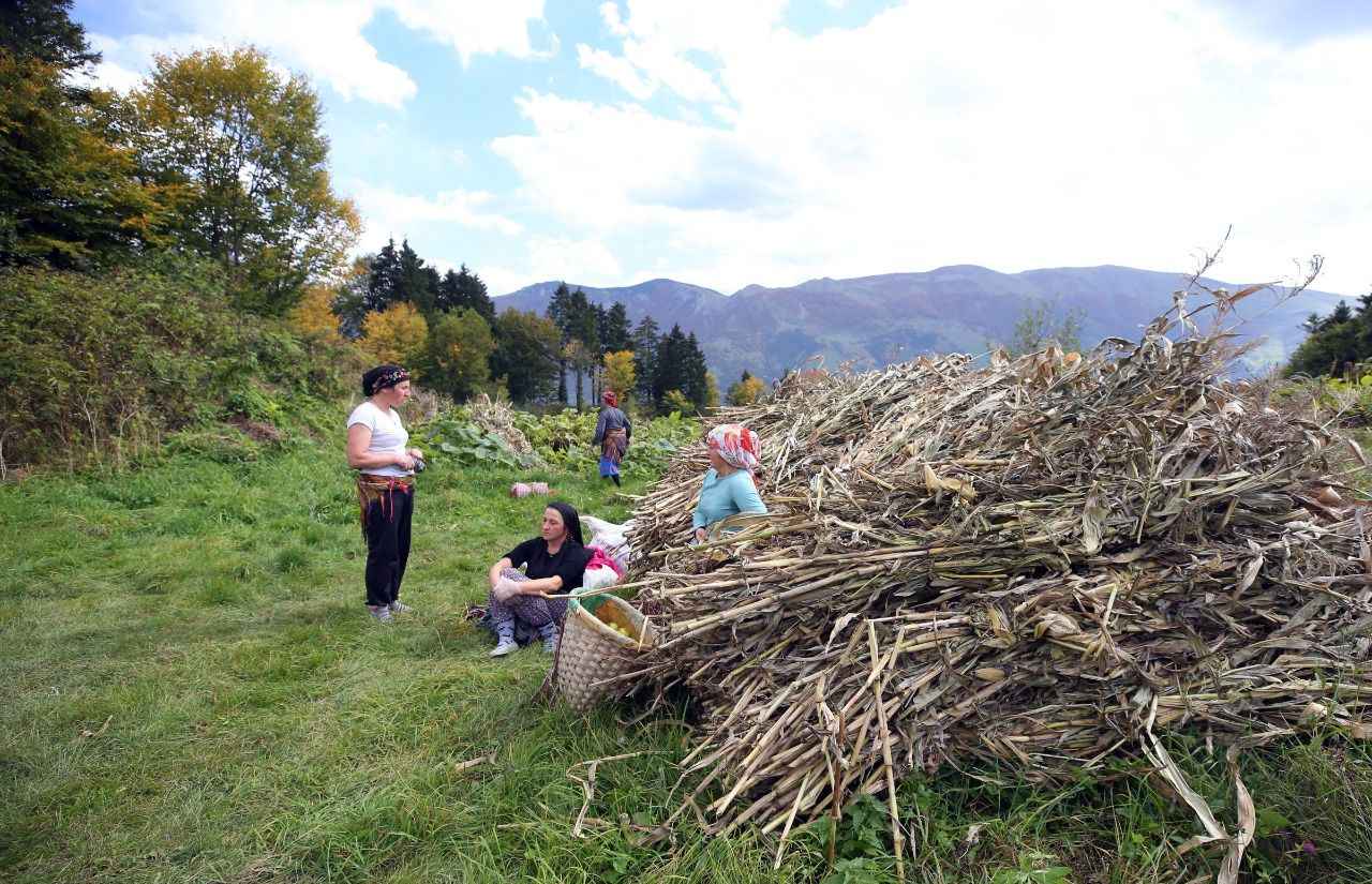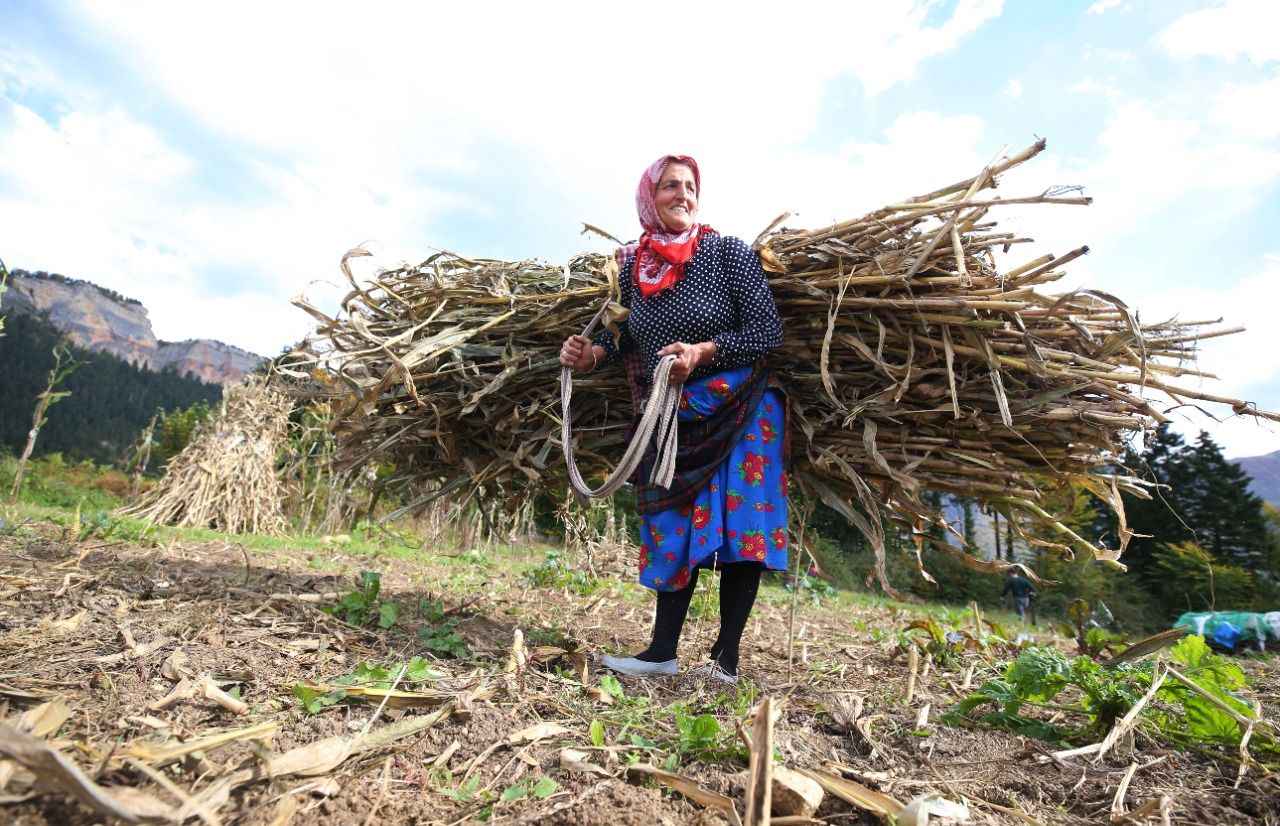 Yaz aylarında tarlalarındaki mısırı toplayan kadınlar, güzün yaşandığı bugünlerde ise geriye kalan yaprak ve saplı kısımları hayvanların yiyebilmesi için emek sarf ediyor. Akraba ve komşuların bir araya gelmesiyle tarlada süren mesai, imece usulüyle tamamlanıyor.