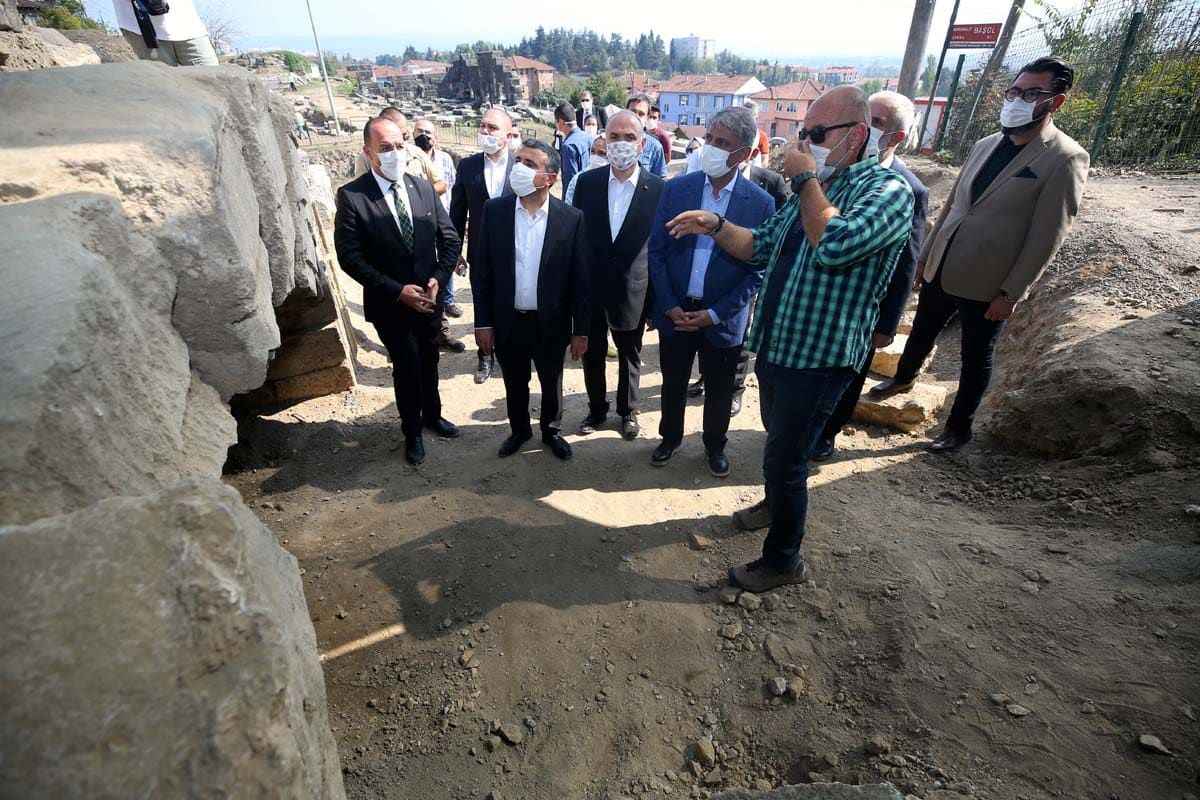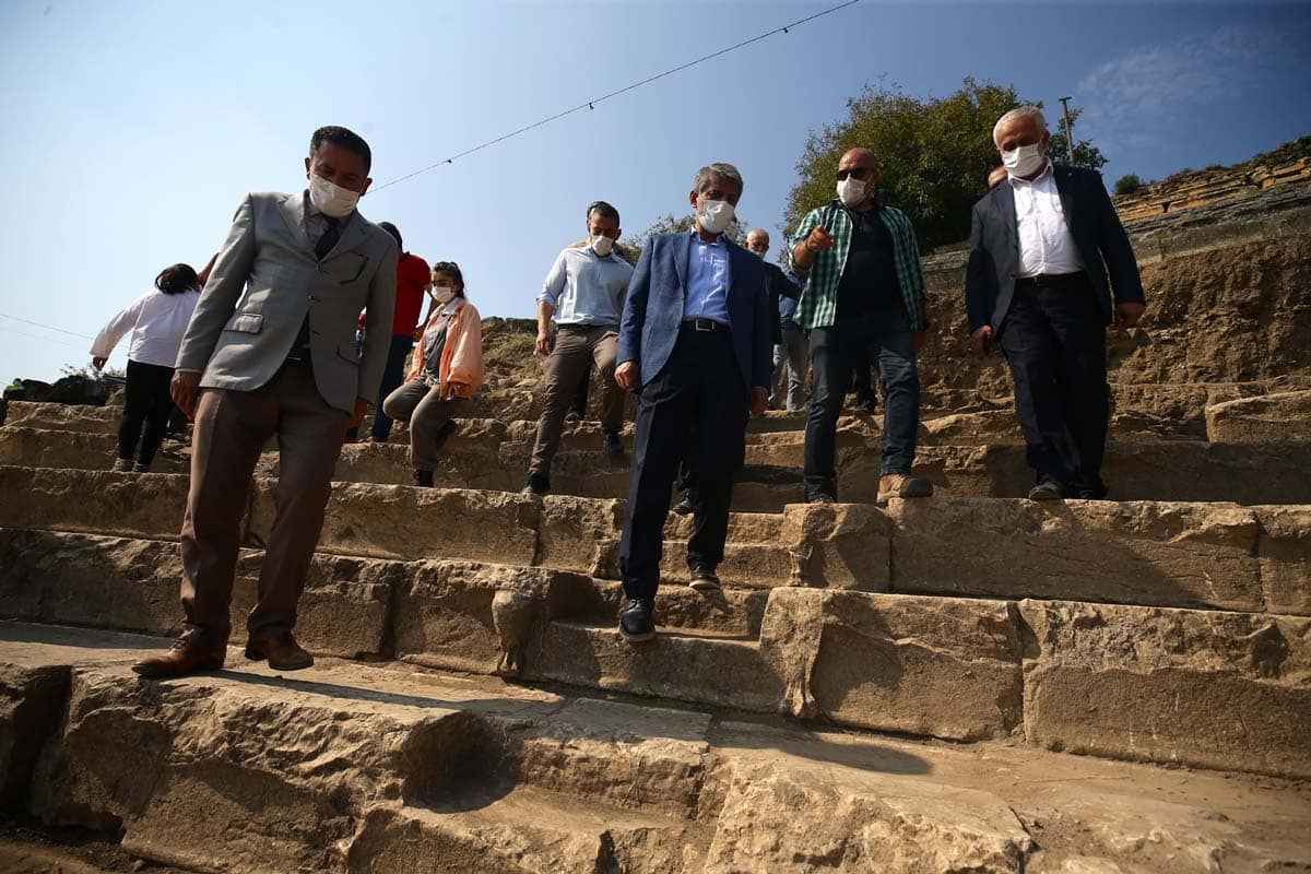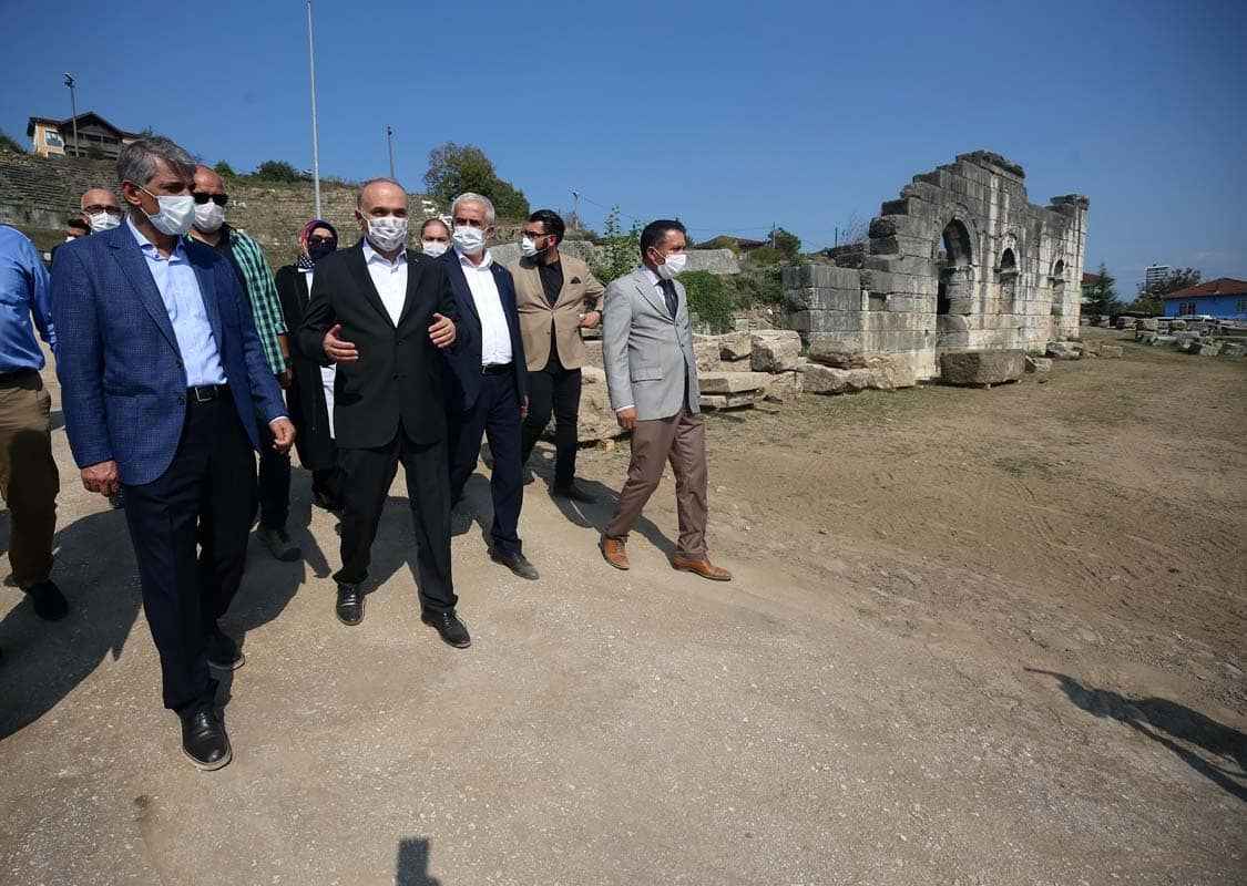 Kentin turizm alanları ve buralarda yapılan çalışmalar hakkında bilgi alan Alpaslan, daha sonra Atay ve Özlü ile kazıların 12 ay devam ettiği Prusias ad Hypium Antik Kenti'nde incelemelerde bulundu.