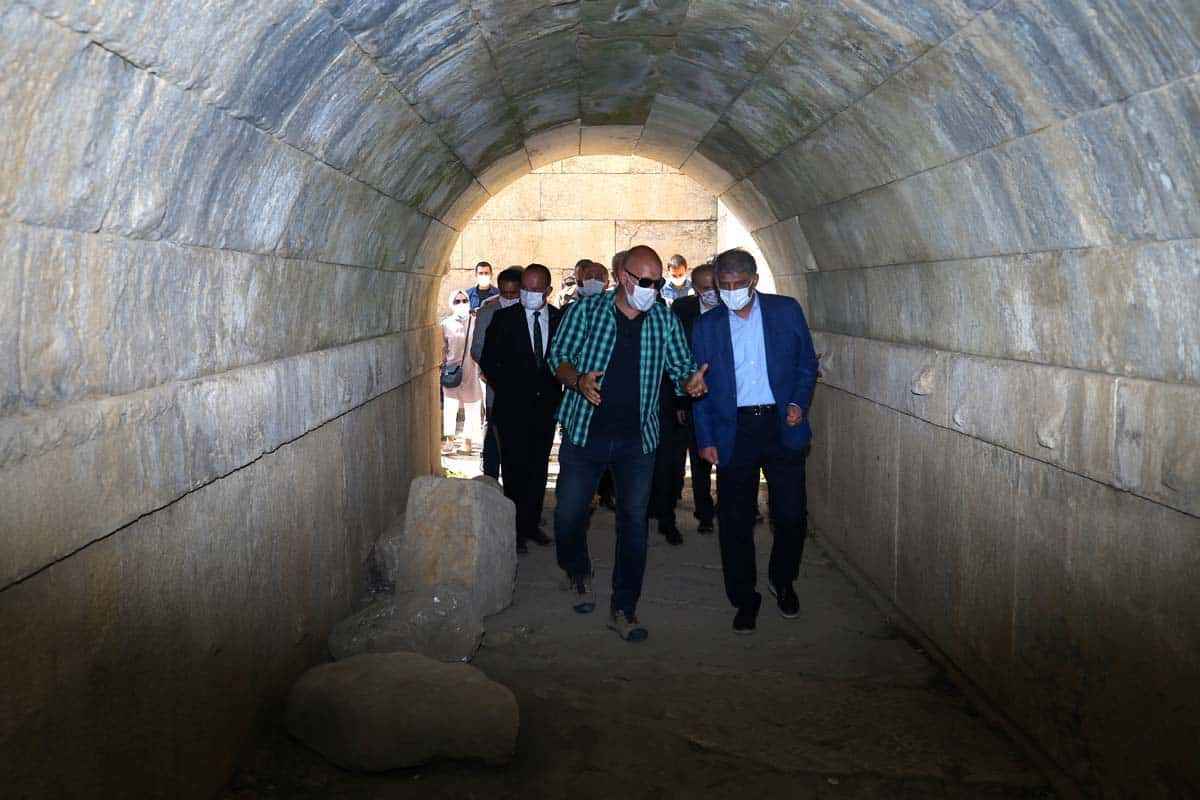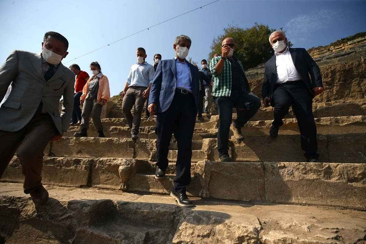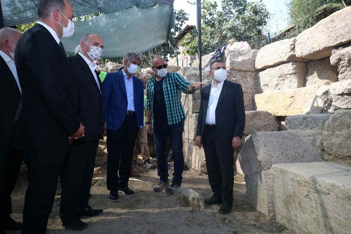 Burada Düzce Üniversitesi Arkeoloji Bölümü Öğretim Üyesi ve Kazı Bilimsel Danışmanı Doç. Dr. Emre Okan'dan çalışmalar hakkında bilgi alan Alpaslan, alanı gezdi.