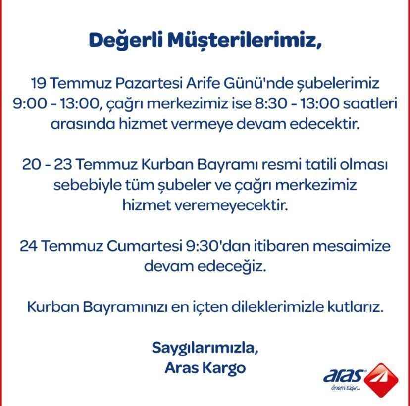 Aras Kargo, yayımladığı duyuruya göre arefe günü 13.00'a kadar çalışacak. Kurban Bayramı'nda ise çalışmaya ara verecek.