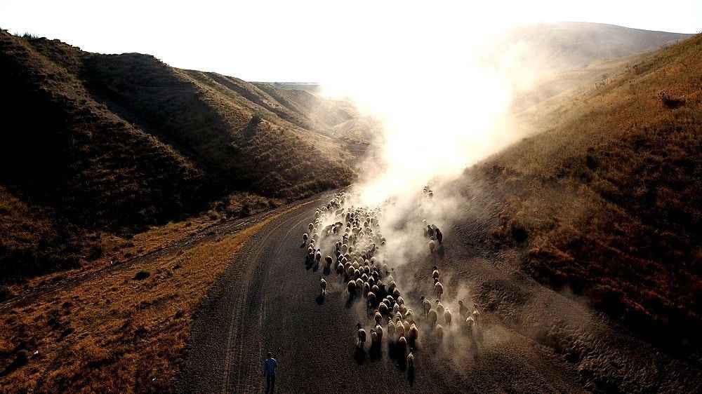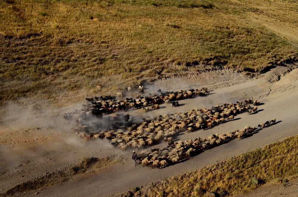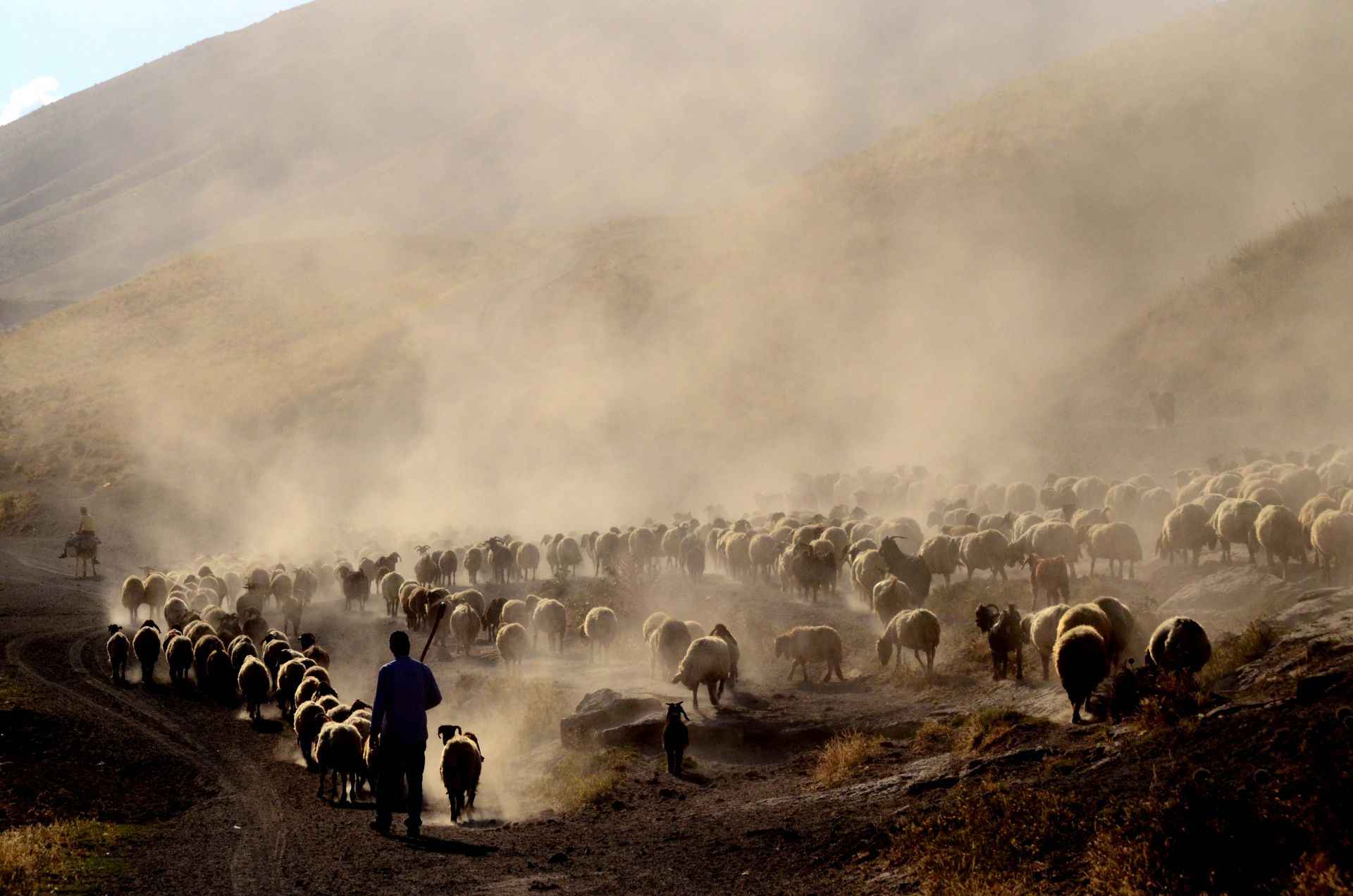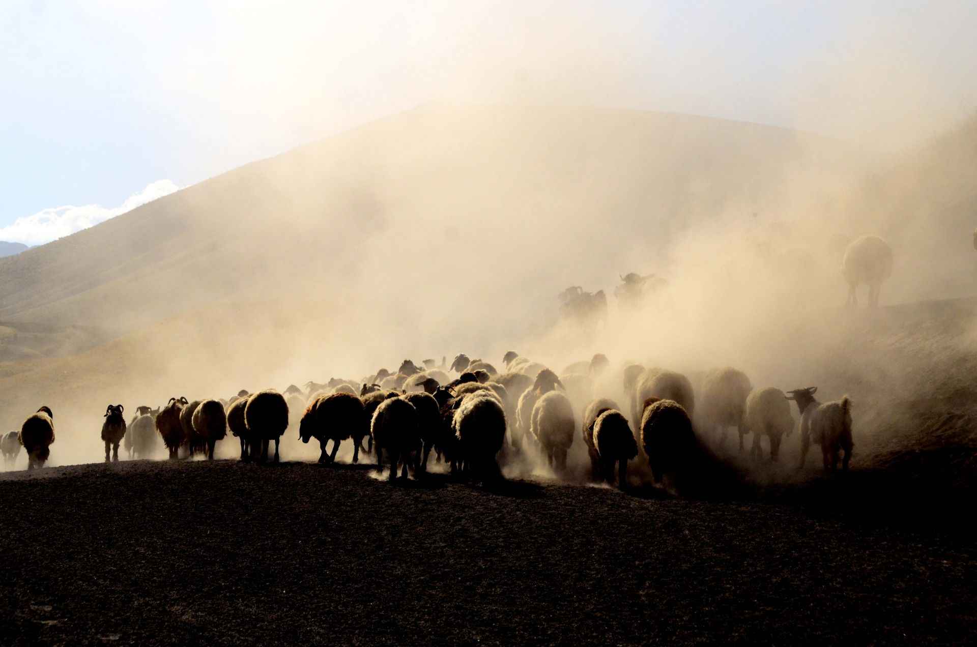 Nemrut Dağı eteklerindeki yaylalara hayvanlarını çıkaran köylüler, bu tozlu yolculuğu her gün gerçekleştiriyorlar. 15 kilometrelik yolu tamamlayan hayvanlar Van Gölü kıyısına gelerek susuzluklarını giderip sağımı bekliyor.