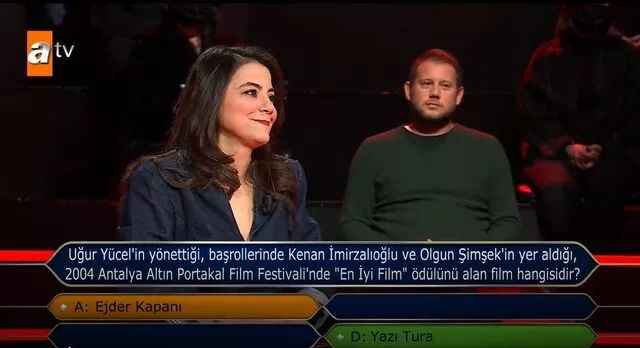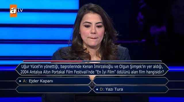 Yarışmacının karşısına ikinci barajda, ” Uğur Yücel’in yönettiği, başrollerinde Kenan İmirzalıoğlu ve Olgun Şimşek’in yer aldığı 2004 Antalya Altın Portakal Film Festivali’nde ‘En iyi Film’ ödülünü alan film hangisidir?” sorusu çıktı.
