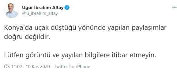 Konya Belediye Başkanı Uğur İbrahim Altay konuyla ilgili paylaşımında, "Konya’da uçak düştüğü yönünde yapılan paylaşımlar doğru değildir. Lütfen görüntü ve yayılan bilgilere itibar etmeyin" ifadelerini kullandı.
