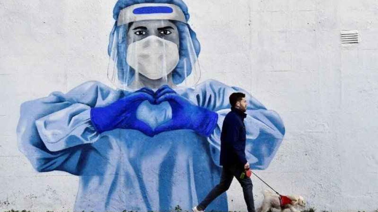DUBLİN, İRLANDA 12 Ocak 2022- İrlanda'nın Dublin kentinde koronavirüsün yayılması sırasında bir cephe görevlisini tasvir eden bir duvar resminin yanından köpeğini gezdiren bir adam.