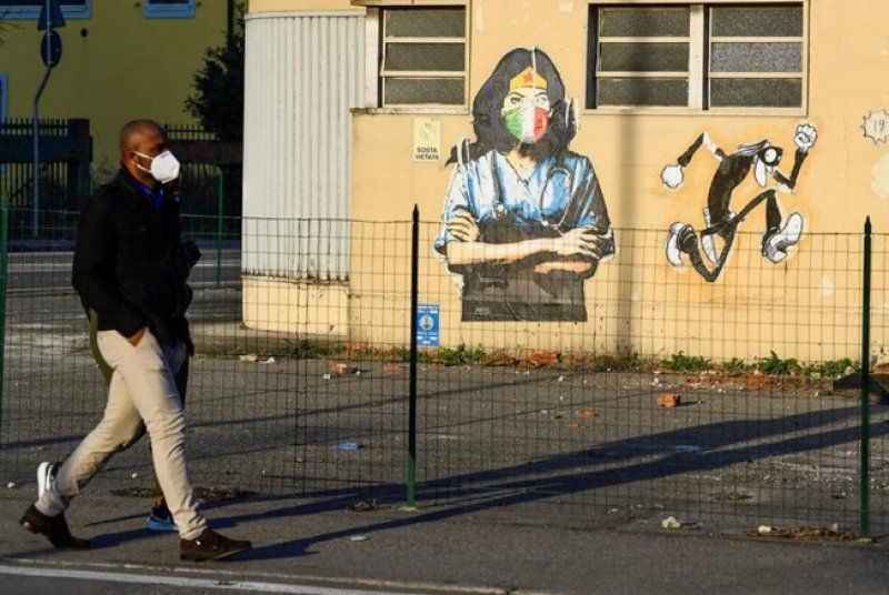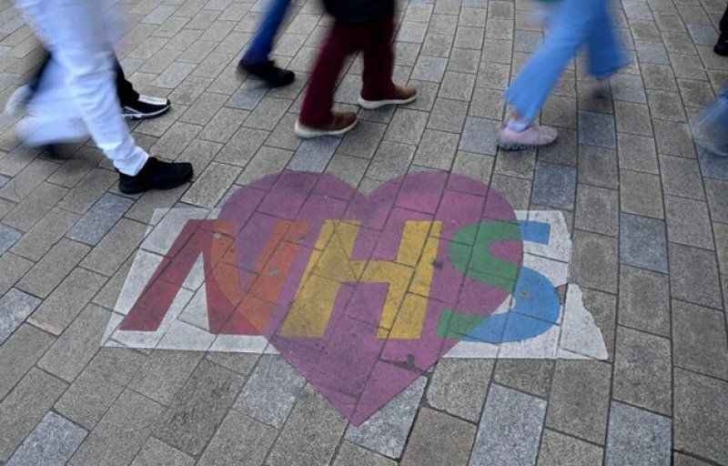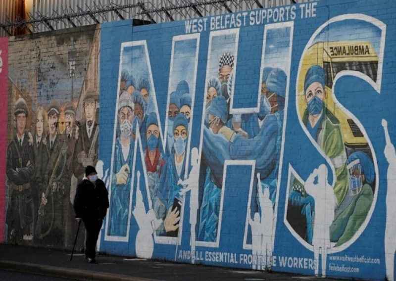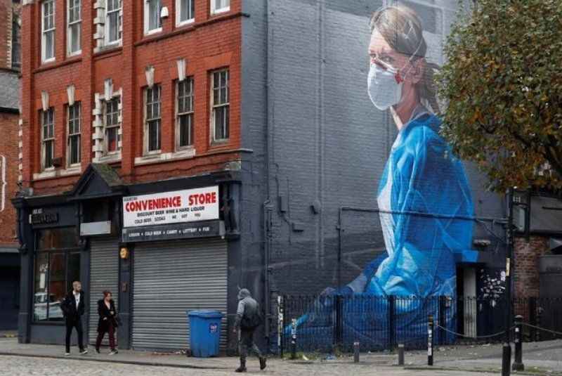 LONDRA, İNGİLTERE 20 Ekim 2021- Alışveriş yapanlar, koronavirüs pandemisinin yayılmasının ortasında İngiltere Ulusal Sağlık Servisi'ni takdir eden bir duvar resminin yanından geçiyor.