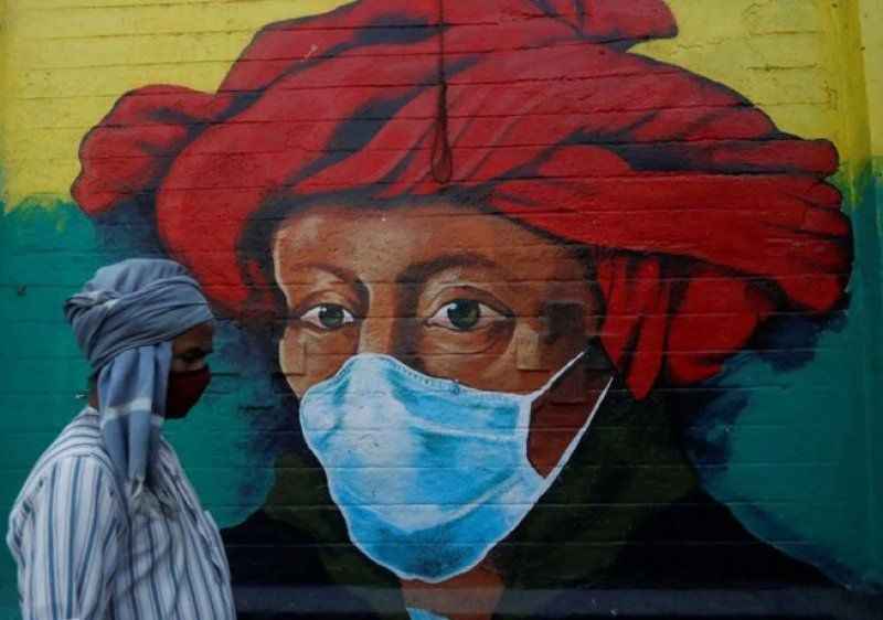 MUMBAİ, HİNDİSTAN 10 Ocak 2022'de- Koruyucu yüz maskesi takan bir adam, Hindistan'ın Mumbai kentinde koronavirüsün yayıldığı bir sokakta bir duvar resminin yanından geçiyor