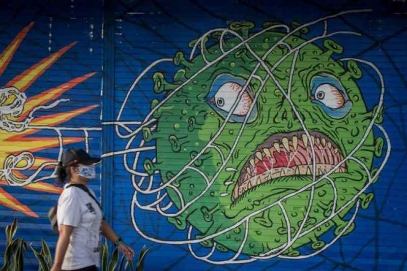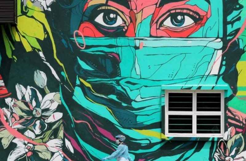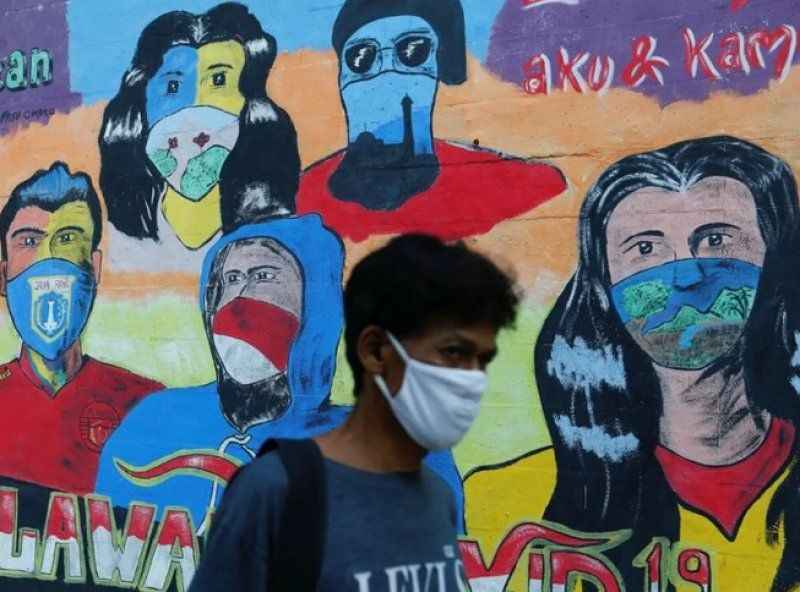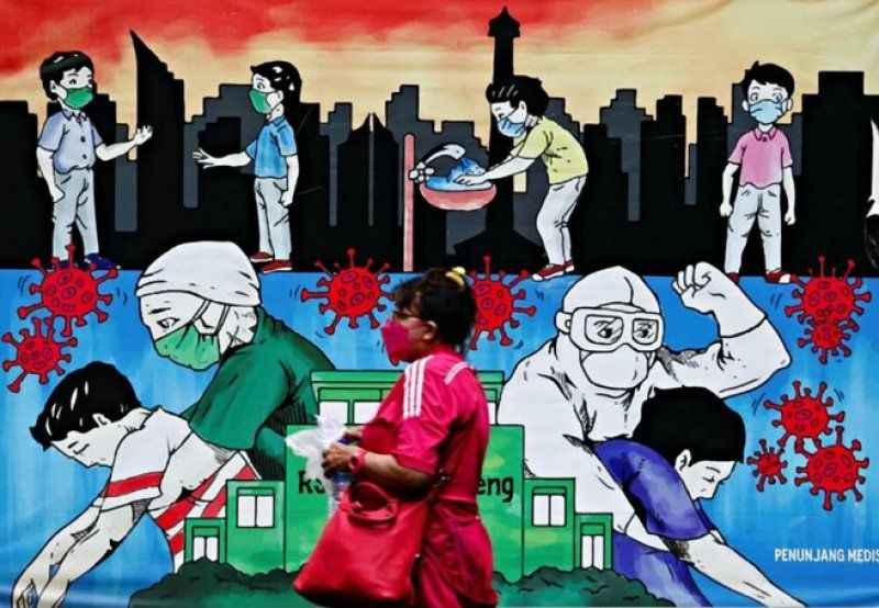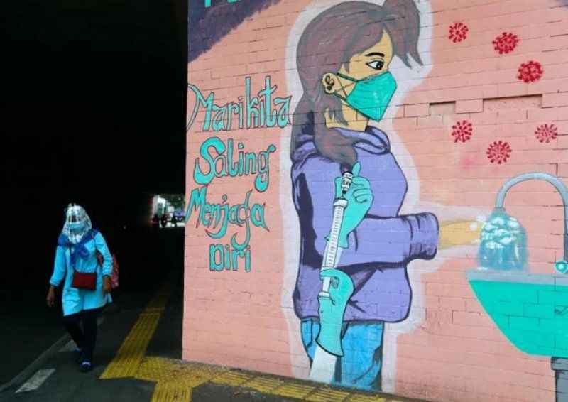 JAKARTA, ENDONEZYA 24 Haziran 2021- Koruyucu yüz maskesi takan bir kadın, Jakarta, Endonezya'da koronavirüs salgını hakkında farkındalığı destekleyen bir duvar resminin yanından geçiyor.