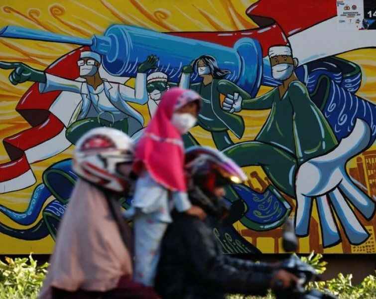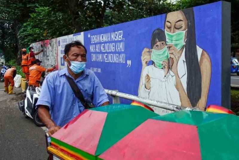 JAKARTA, ENDONEZYA 24 Temmuz 2021- Koruyucu maske takan bir adam, Endonezya'nın Jakarta kentinde, koronavirüs salgını sırasında maske takma bilincini kampanyaya geçiren bir duvar resminin yanından arabayı itiyor.