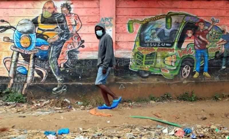 NAİROBİ, KENYA 18 Temmuz 2021- Bir adam Kenya, Nairobi'deki Kibera yerleşiminde koronavirüs salgınını savunan bir duvar resminin yanından geçerken yüz maskesi takıyor.