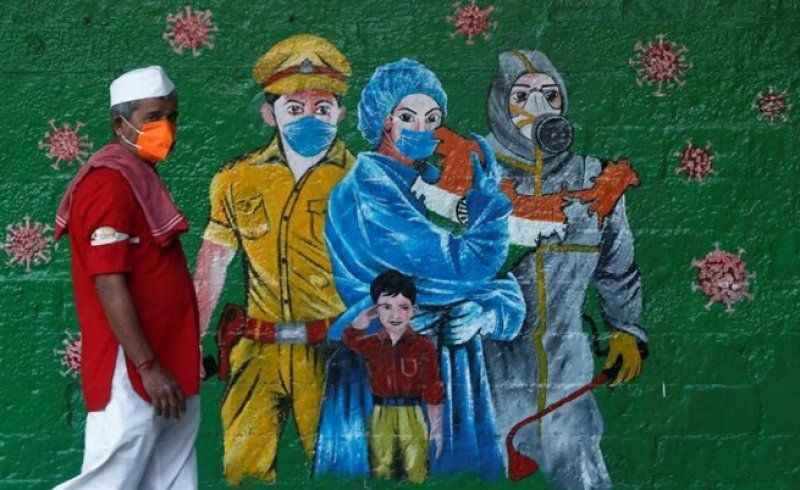MUMBAİ, HİNDİSTAN 10 Ocak 2022- Hindistan'ın Mumbai kentinde koronavirüsün yayıldığı bir sokakta bir duvar resminin yanından geçen bir adam.